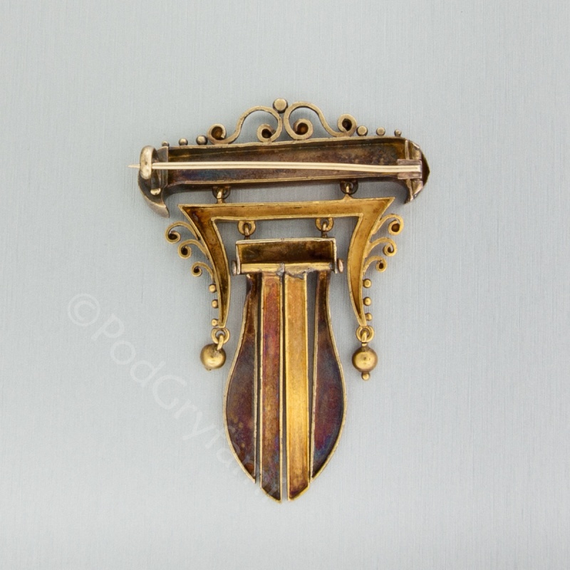 14 carat gold brooch covered with a higher purity gold coating. The jewel was created in the 19th century in a styling referring to ornaments made and used by medieval European knights. The goldsmith who made the brooch, although he drew on the design of the Middle Ages, gave it a character that perfectly fits the jewel into the canon of beauty of contemporary jewelry. Thanks to the patina and lack of unnecessary decorations, it can also decorate a man's tie or ascot.
