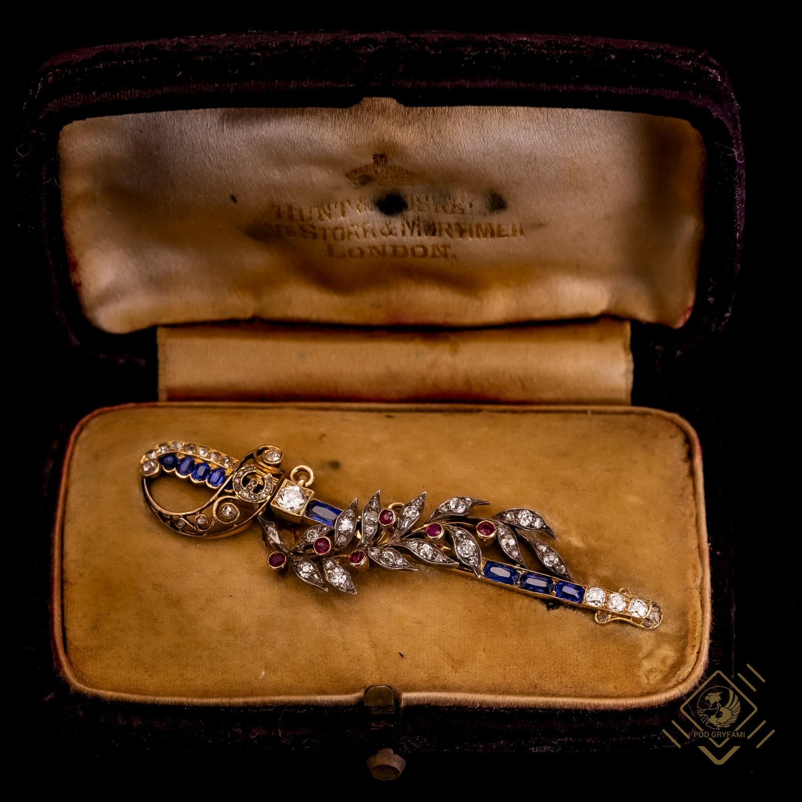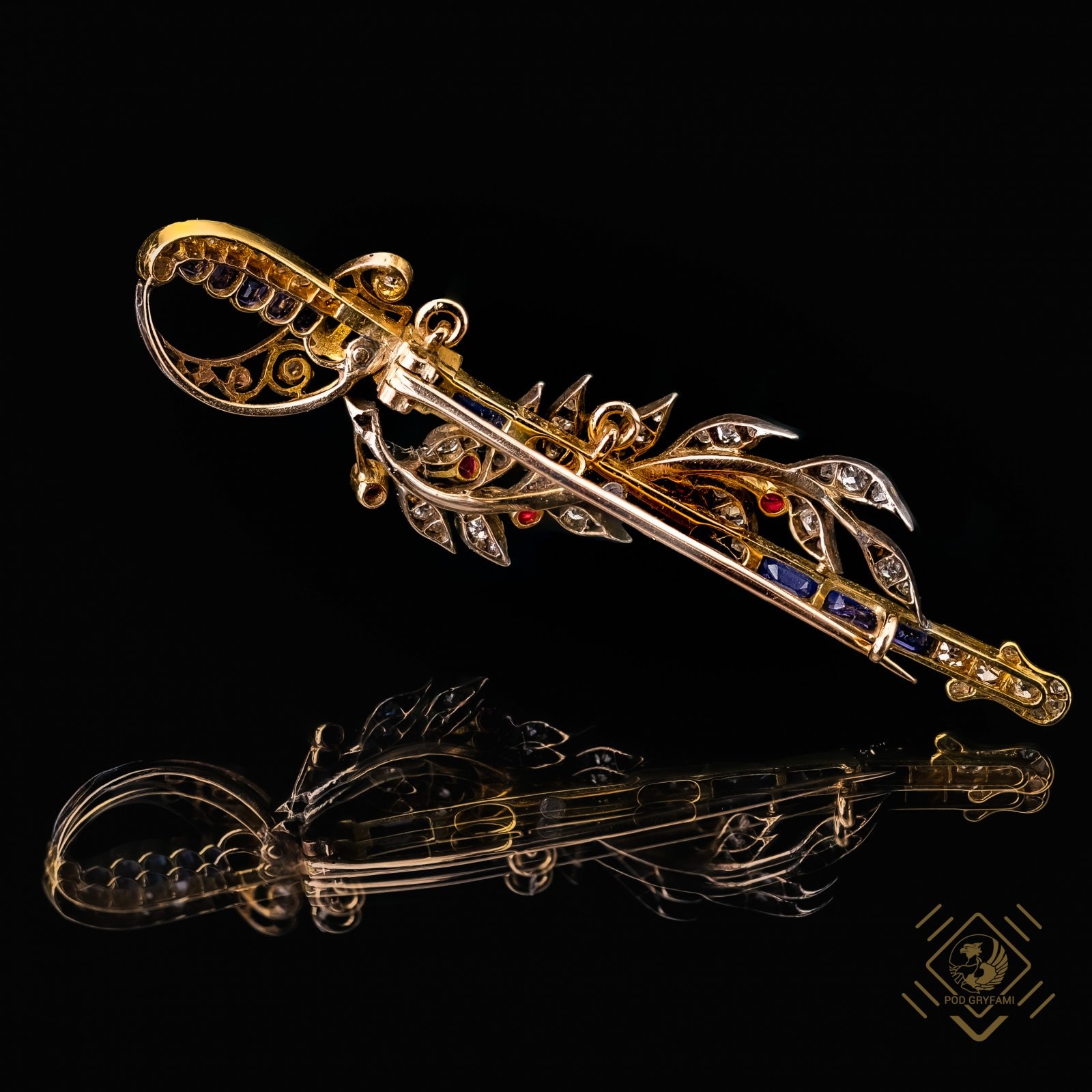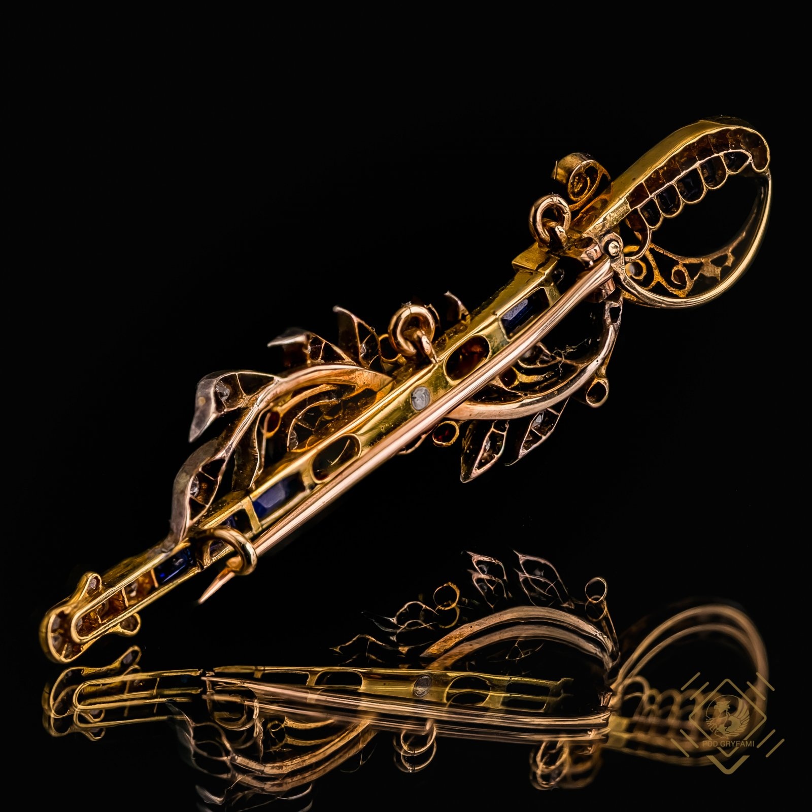 Niezwykły wiktoriański klejnot zaprojektowany jako szabla przepasana laurową gałązką. Broszę wykonano ze złota łączonego ze srebrem ozdobionego szafirami, rubinami, rozetami diamentowymi oraz idealnie dobranymi mieniącymi się delikatnym blaskiem diamentami. Klejnot powstał około 1895 roku w czasie tak zwanej ,,Złotej ery biżuterii". Rozwój przemysłu, nowe technologie i łatwiejszy dostęp do kolorowych kamieni szlachetnych umożliwił tworzenie absolutnie wyjątkowych wykonanych z doskonałą precyzją miniaturowych dzieł sztuki jubilerskiej. Broszę dzięki specjalnym uchwytom można nosić również jako efektowny wisior.