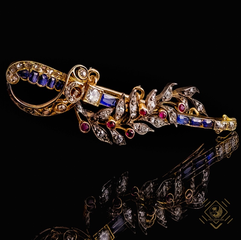 A remarkable Victorian jewel designed as a sabre with a laurel branch. The brooch is made of a gold-silver alloy and decorated with sapphires, rubies, diamond rosettes and perfectly fitting diamonds shimmering with a delicate glow. The jewel was created around 1895 during the so-called "Golden Age of Jewelry". The development of industry, new technologies and easier access to colorful precious stones enabled the creation of unique miniature pieces of jewelry made with excellent precision. Thanks to special handles, the brooch can also be worn as a spectacular pendant.