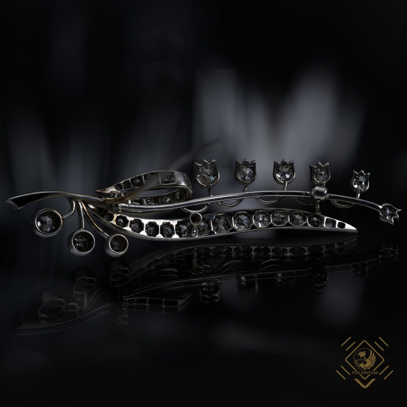 This brooch was made in white gold and silver in the shape of a lily of the valley, whose leaves and flowers are decorated with diamonds. The jewel was created around 1900, when Art Nouveau was in full bloom. Fluid lines and floral motifs so characteristic of French Art Nouveau suggest that the brooch could have been made in France. Unfortunately, it does not have any markings, which is a pity because the precision of the workmanship testifies to the artist's high craftsmanship. An additional advantage is a well-protected clasp.