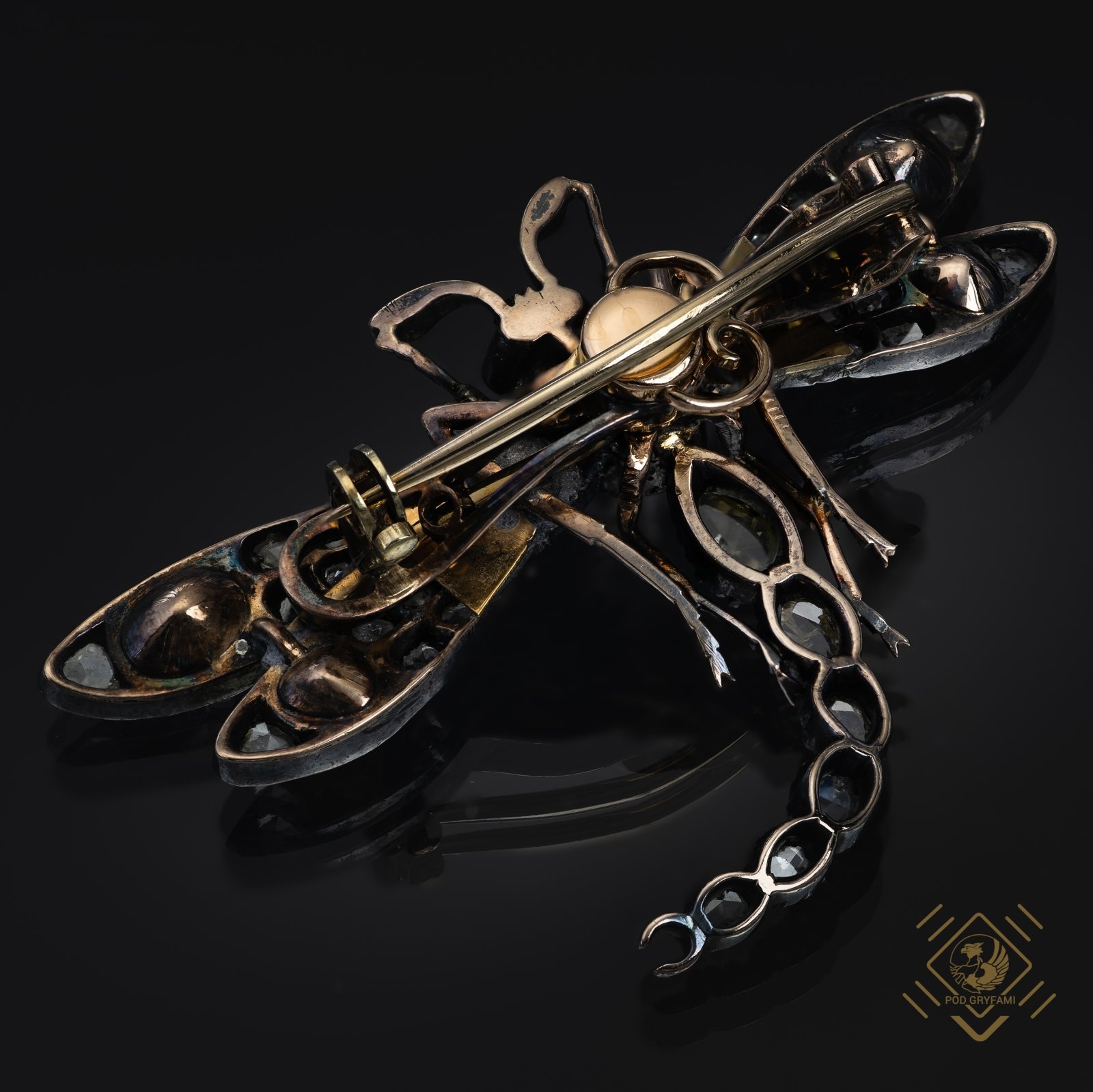 Srebrno złota konstrukcja w formie ważki ozdobiona diamentami o szlifie rozet antwerpskich. Oczy oraz czułki owada zdobią niewielkie rubinki. Projekty biżuterii z przełomu wieków doskonale wpisują się w estetykę późniejszej epoki secesyjnej. Zafascynowanie światem przyrody znajduje odzwierciedlenie w wiernym odwzorowaniu otaczającej nas rzeczywistości. Fauna i flora stają się ulubionymi wątkami złotnictwa. Brosza stanowi doskonały przykład niezwykłego kunsztu i precyzji wykonania, finezji formy oraz idealnie dobranych kamieni. Nie lada gratka dla miłośników zoomorficznych przedstawień w biżuterii posiadającej nieodparty urok starych klejnotów.