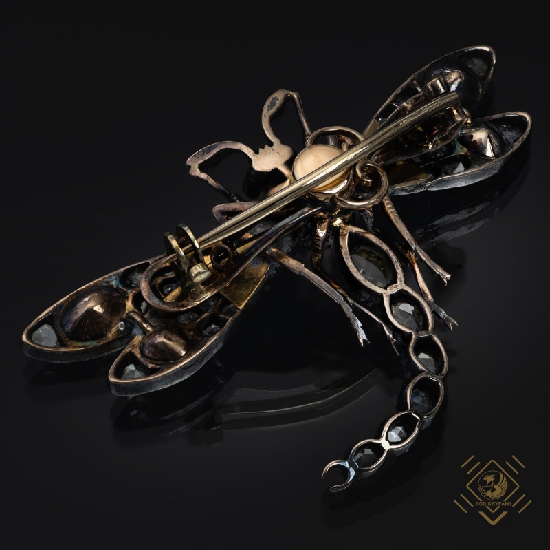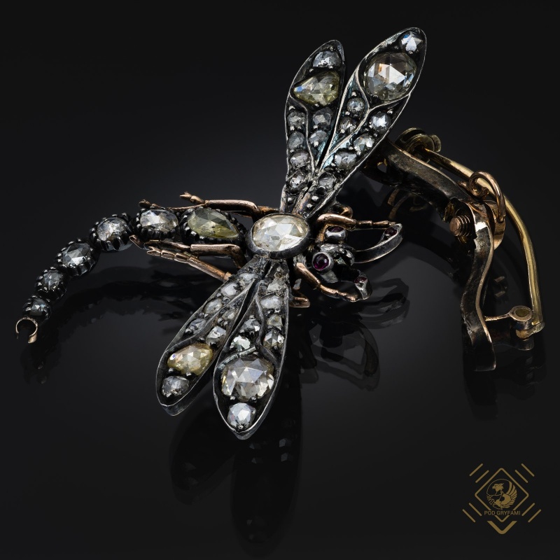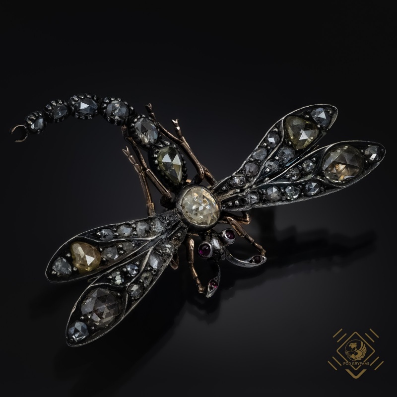 Silver gold dragonfly design filled with Antwerp diamond cut rosettes. The eyes and antennae of the insect is adorned with small rubies. Designs of jewelry from the turn of the century perfectly fit the aesthetics of the late Art Nouveau era. Fascination with the world of nature is reflected in a faithful representation of the surrounding reality. Fauna and flora became the favorite motifs of goldsmiths. This brooch is a perfect example of the unusual craftsmanship and precision of workmanship, finesse of form and perfectly matched stones. A real treat for lovers of zoomorphic representations in jewelry with the irresistible charm of old jewels.