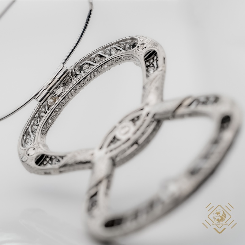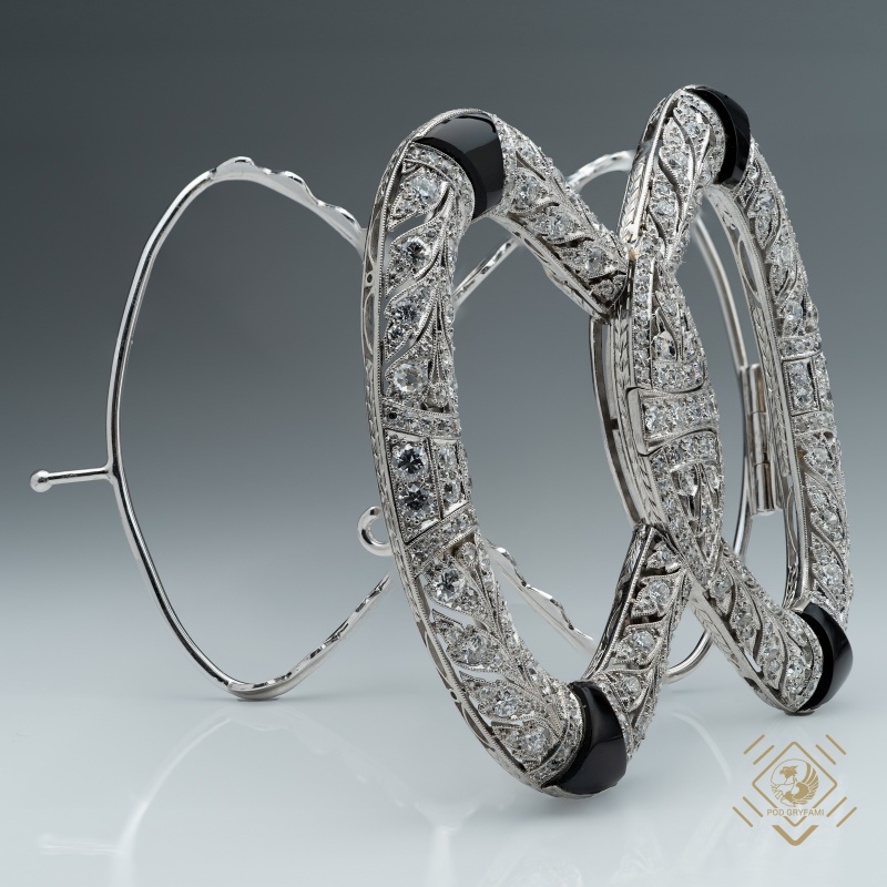 The undeniable charm of the bow motif combined with a subtle, almost lace-like floral sheet filled with old European cut diamonds. The "Living Fire" of the diamonds is emphasized by the brightness of platinum and by the contrasting deep black of the onyx. The rare gem serves as a hair clip emphasizing the beauty and social status of its owner. The hair clip, adhering to the trends of Edwardian jewelry, captivates not only with its sublime composition, the beauty of the stones of the old grinding but also with its professional execution.