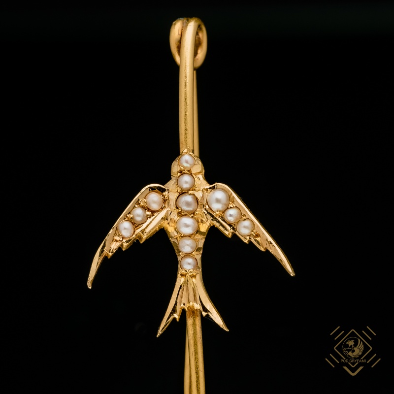 A delicate, small brooch with a swallow motif decorated with tiny pearls. The themes of flora and fauna, realistically depicted birds, insects, snakes, flowers, leaves, ivy twigs or vines – spread in the middle of the 19th century after the 1851 London World Exhibition. These motifs were particularly beloved in a later era by the Art Nouveau movement. In addition, this subtle gem is given a unique character by the swallow, which is a symbol of good hope and a longing for freedom.