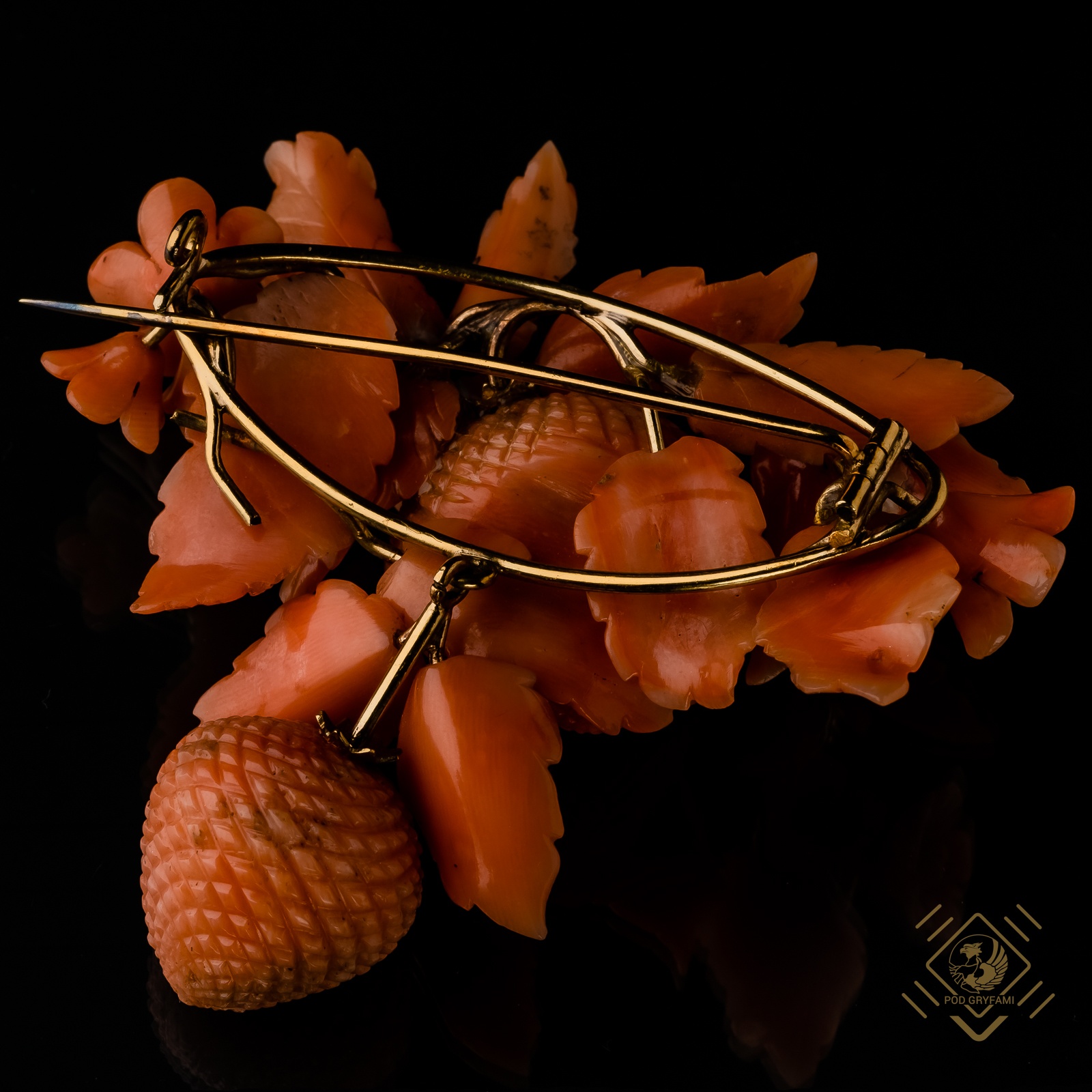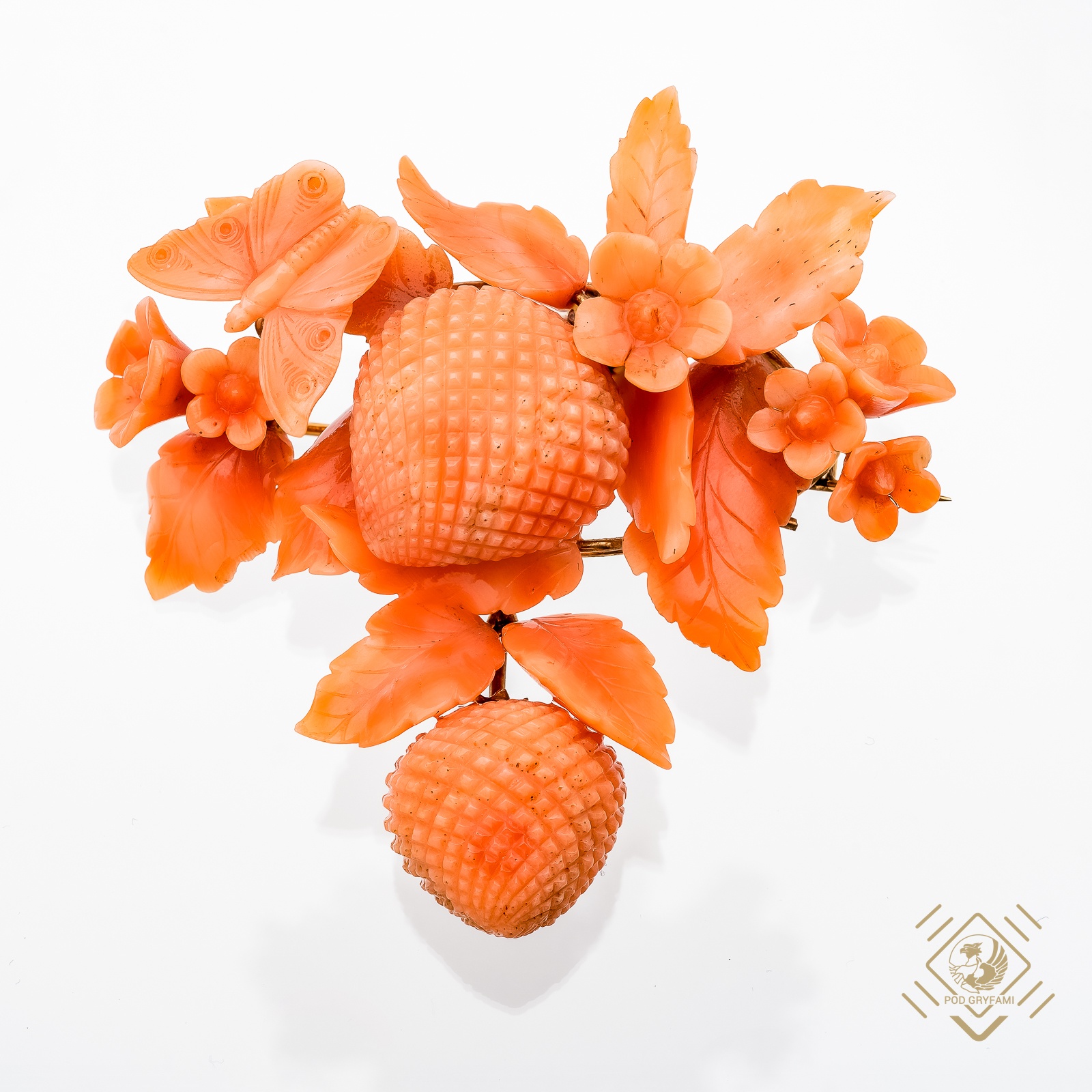 Absolutny hit epoki wiktoriańskiej. Piękna kompozycja w koralu ( corrallium rubrum). Na gałązce krzewu poziomki ( fragaria vesca ) wśród owoców i kwiatów przysiadł niewielki motyl. Biżuteria okresu romantycznego wykorzystywała w swych projektach zaczerpnięte z natury motywy. Rośliny, kwiaty , muszle czy zwierzęta były ulubionym tematem projektantów. Dominowała lekkość i delikatność. Brosza zachwyca mistrzostwem wykonania oraz kompozycją łączącą w sobie wdzięk i urodę korala o delikatnej łososiowej barwie. Klejnot jest niezwykle rzadkim kolekcjonerskim okazem zarówno dla miłośników biżuterii z koralami jak i koneserów klejnotów z epoki wiktoriańskiej.
