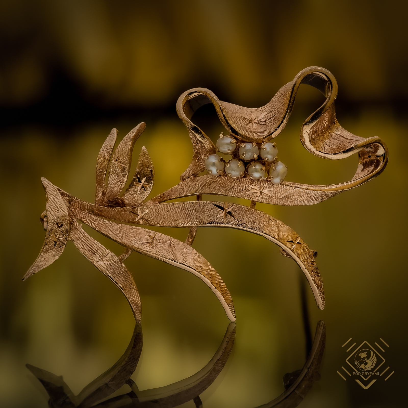 Przestrzenna forma nawiązująca w konstrukcji do gałązki kwiatu. Liście oraz nieregularny kształt kielicha wykonane z piaskowanego złota ozdobione sześcioramiennymi, precyzyjnie cyzelowanymi gwiazdkami. Środek kielicha wypełniony asymetrycznie ułożonymi perełkami rzecznymi. Uroczy, bardzo kobiecy drobiazg doskonale nadający się na prezent.
