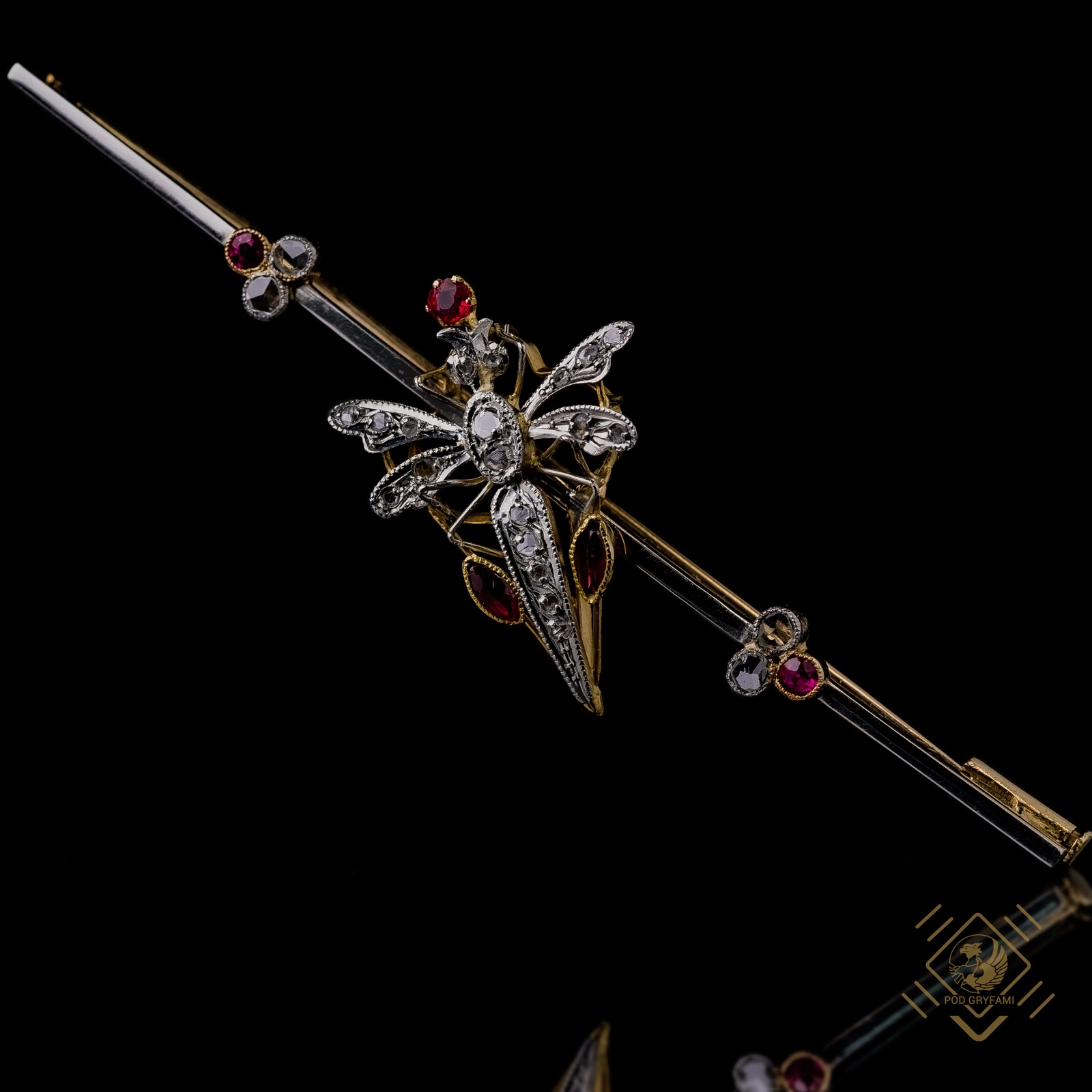 Kolejny przykład realistycznego odtworzenia natury w jubilerstwie. Urocza diamentowa ważka posadowiona na lekkiej wykonanej ze złota konstrukcji. Trzy czerwone okrągłe rubinki oraz dwa granaty w szlifie markizy tworzą wyrazisty kontrast dla lśniących diamentowych rozet. Brosza zachwyca nie tylko finezją formy, pięknem kamieni ale również kunsztem pracy jubilerskiej. Dodatkowym atutem klejnotu jest precyzyjnie wykonane zabezpieczenie zapięcia.