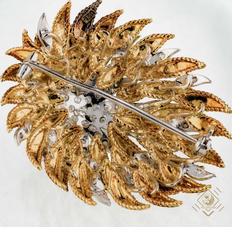 This piece has gorgeous 1960s style. Its cascading petals are filled with diamonds and cobalt enamel. A small diamond flower in the center sparkles with dazzling brilliance. The piece framed in gold, giving it a warm yellow color intertwined with a few accents of white. This unique piece of jewelry was certainly made on individual order for a lady with refined taste.