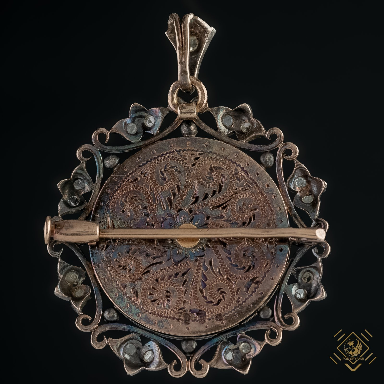 Okres Wielki biżuterii wiktoriańskiej to ponadczasowa klasyka czarująca swoją symboliką. Dominacja kamieni szlachetnych o zdecydowanie ciemnej barwie w połączeniu z diamentami oraz rozetami diamentowymi to bardzo charakterystyczne elementy wykorzystywane do wykonywania klejnotów. Brosza zachwyca idealnie okrągłą formą oraz niezwykłym kunsztem pracy jubilerskiej. Historyczny egzemplarz biżuterii dwufunkcyjnej.