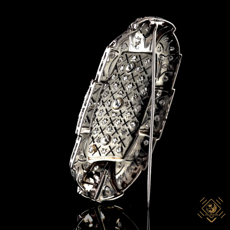 An Art Deco classic. Hand made lace style in platinum, decorated with old cut diamonds (old European cut) and diamond rosettes. The elegance and sophistication of the style is emphasized by symmetrical geometric form. A masterpiece of goldsmith work, giving subtlety and finesse to a brooch of such an impressive size.