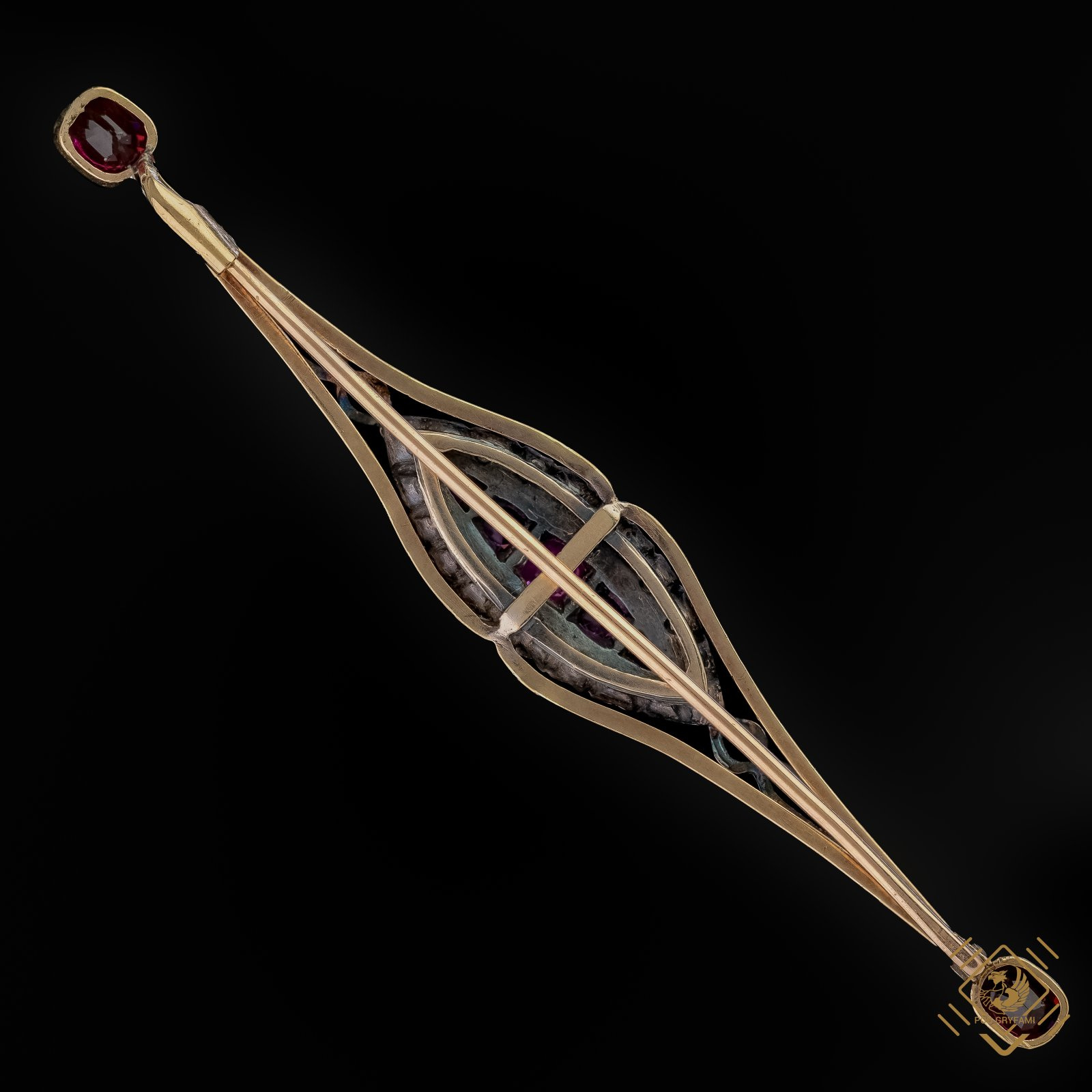 Idealna harmonijna forma z wpisanymi rubinami i rozetami diamentowymi. Dla znawców epoki nie będzie żadnym zaskoczeniem, że dwie boczne ozdoby zostały kameryzowane ciętym szkłem w barwie czerwonego wina, bowiem biżuteria okresu Secesji oraz Art Deco charakteryzowała się łączeniem kruszcu i kamieni szlachetnych z bakelitem, szkłem czy też kamieniami syntetycznymi.