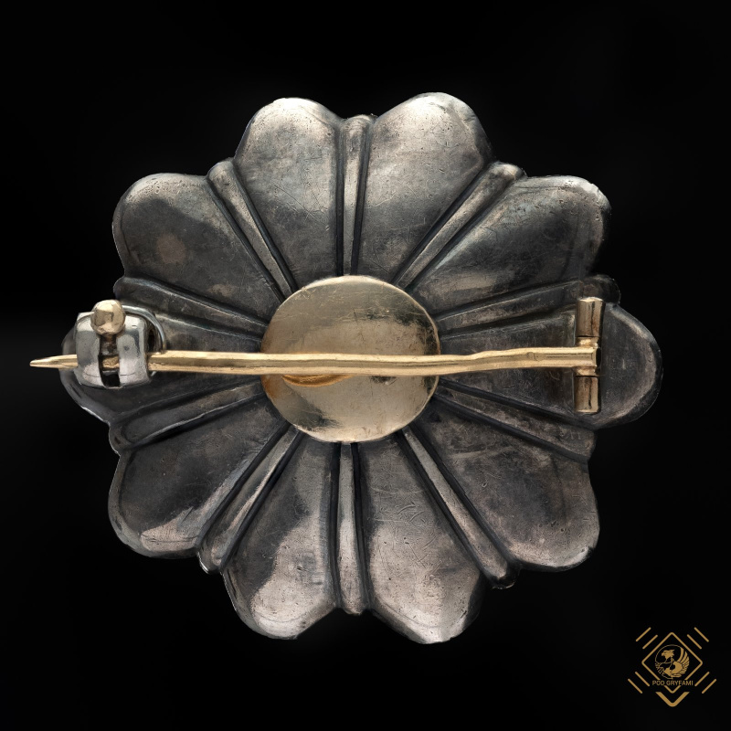 A slightly flattened form of a rosette decorated with garnets accompanied by diamond rosettes. Binding, closed, from silver, with a 19 carat gold pin. Old faceted cuts emphasize the beauty of the dark burgundy garnets, while shiny diamond rosettes complete the whole thing.