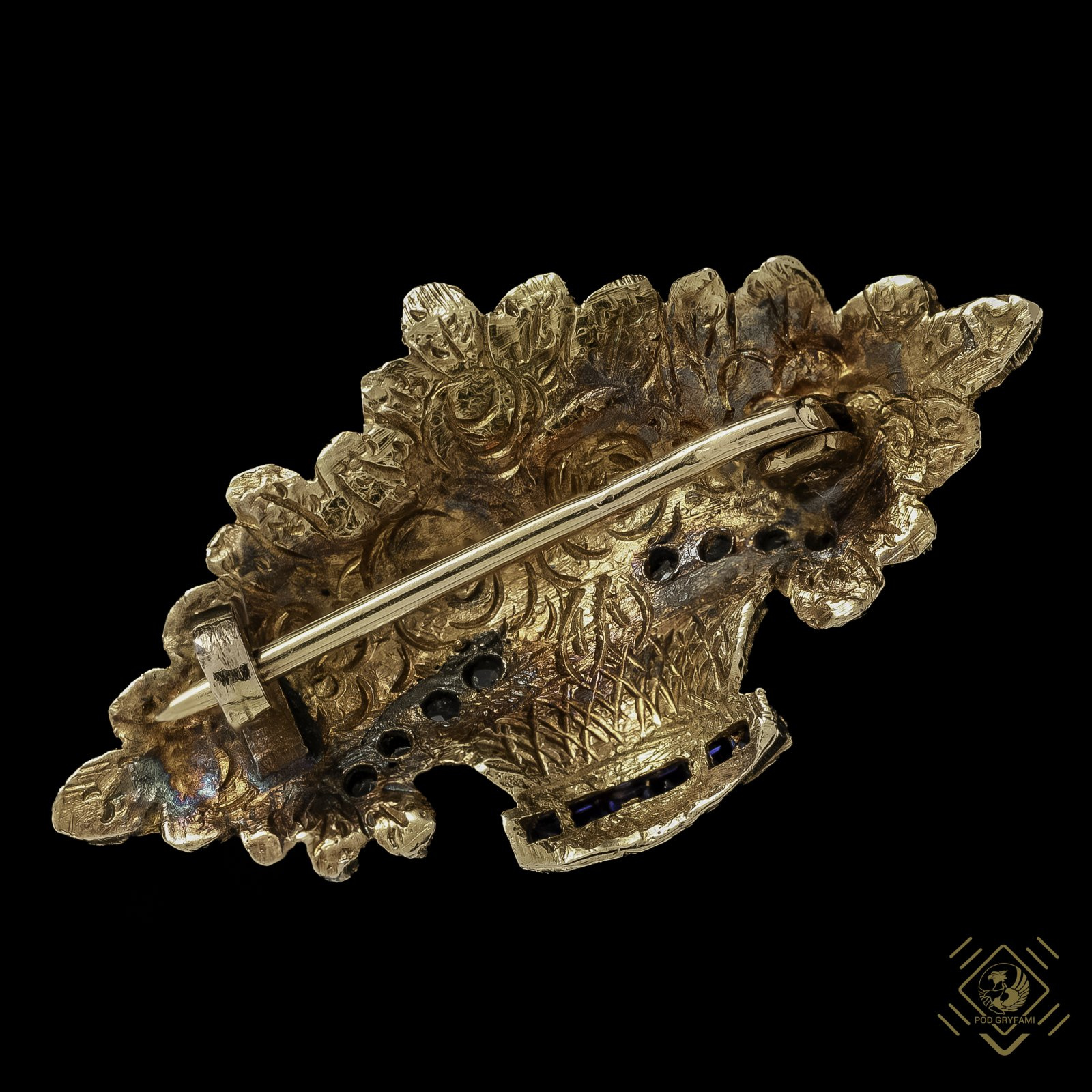 Niewielki koszyczek pełen kwiatów z dominantą róż wykonany w złocie przyozdobiony szafirami oraz rozetami diamentowymi. Na szpili umieszczone cechy probiercze charakterystyczne dla Lizbony z końca XIX wieku. Wspaniały drobiazg dla kobiety ceniącej piękno biżuterii minionej epoki.