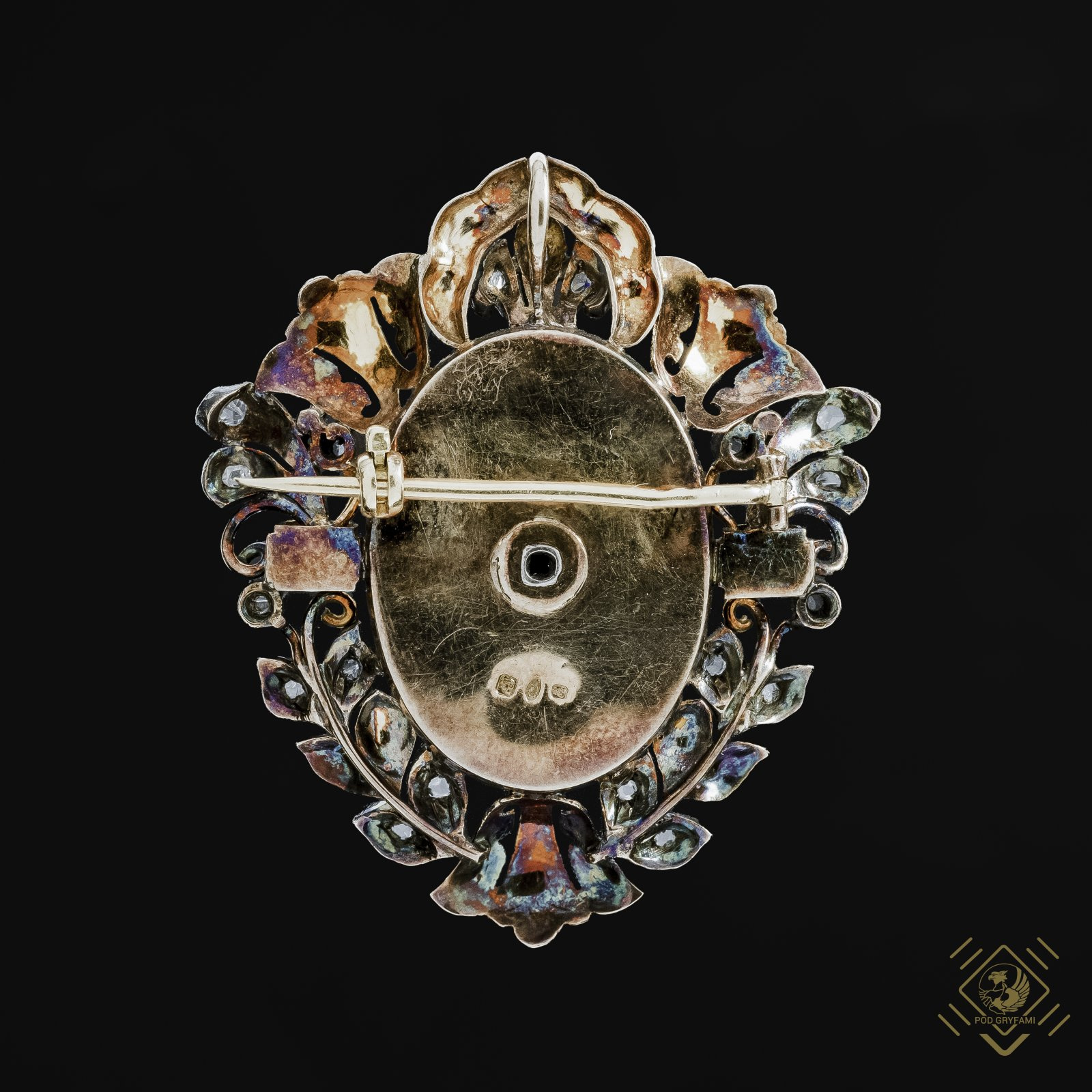 Wspaniała kompozycja będąca odwzorowaniem rokokowego kartusza otaczającego tarczę herbową z motywem lilii białej nazywanej lilią Św Antoniego. Srebrno-złota konstrukcja stanowi podstawę dla owalnej onyksowej płytki, na której umieszczono zdobienie w kształcie lilii. Całość dekorowana rozetami diamentowymi.