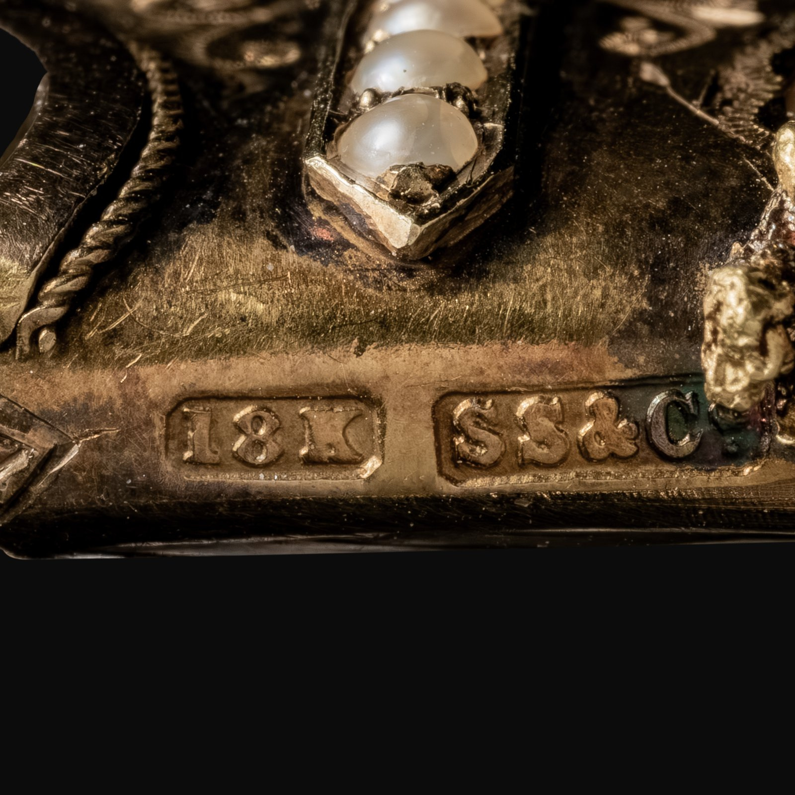 Wspaniały majestatyczny tygrysi pazur oprawiony w 18 karatowe złoto z umieszczonym na szczycie złotym lwem jakże charakterystycznym symbolem Wielkiej Brytanii podkreślającym władzę, odwagę i szlachetność. Ponadto wspaniały cyzelunek ozdobiony rzędem niewielkich kremowobiałych perełek wszystko to czyni z klejnotu absolutnie niepowtarzalną i niezwykle oryginalną broszę/zapinkę. Brosza została wykonana u schyłku epoki wiktoriańskiej w pracowni uznanej brytyjskiej firmy jubilerskiej Saunders&Shepherd.
