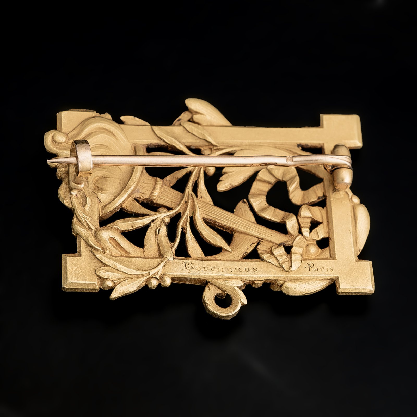 Niewielki, niby prosty, wykonany tylko ze złota a jednak wspaniały egzemplarz secesji francuskiej, czy jak ktoś woli art nouveau. Brosza sygnowana przez jedną z legendarnych biżuteryjnych marek na świecie.