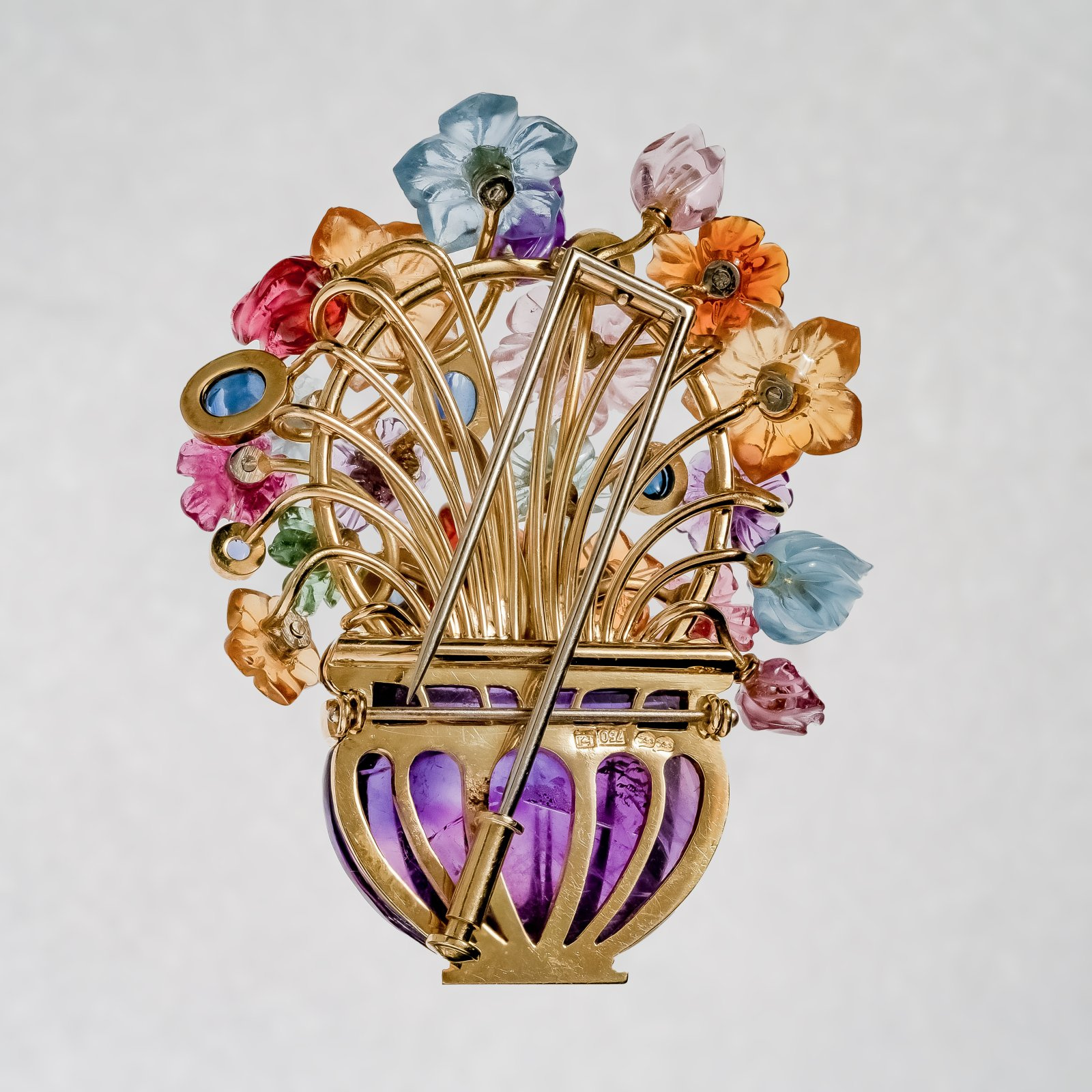 Okazała brosza typu Giardinetto ( z włoskiego mały ogród ). Wspaniały bukiet złożony z niezwykle barwnych kwiatów. Diamentowe środki otulone przez delikatne płatki i listki wykonane mistrzowską ręką z kolorowych kamieni szlachetnych. Złote łodyżki zatopione w ametystowym koszu podtrzymywanym przez złote obręcze. Doskonałe uzupełnienie kolekcji nietuzinkowej biżuterii idealnie pasujące dla kobiety, której życie ,,mieni się" tysiącem barw.