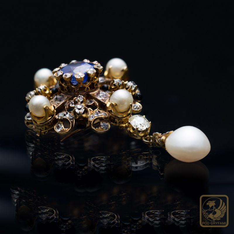 Brooch with sapphires, diamonds and natural pearl in 19th century style. The history of jewelry design was marked by both the Georgian and Victorian period. The unique preciosity, which was created in the times of the flourishing colonial power of Great Britain, is characterized by a wealth of design, oriental symbolism, precise hand work emphasized by the most noble of jewels, today so difficult to obtain.
