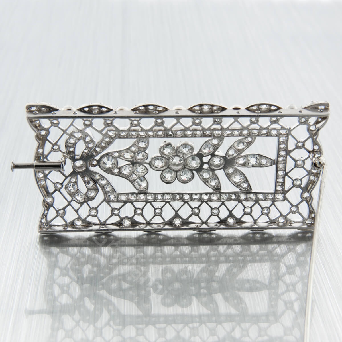 Platynowa brosza kameryzowana diamentami powstała na styku dwóch wspaniałych epok Secesji i Art Deco. Motyw roślinny oraz piękna kokarda tak bardzo charakterystyczne dla secesji francuskiej wpisane w geometryczną artdecowską formę. Precyzja wykonania świadczy o wysokim kunszcie artysty. Dodatkowym atutem jest dobrze zabezpieczone zapięcie