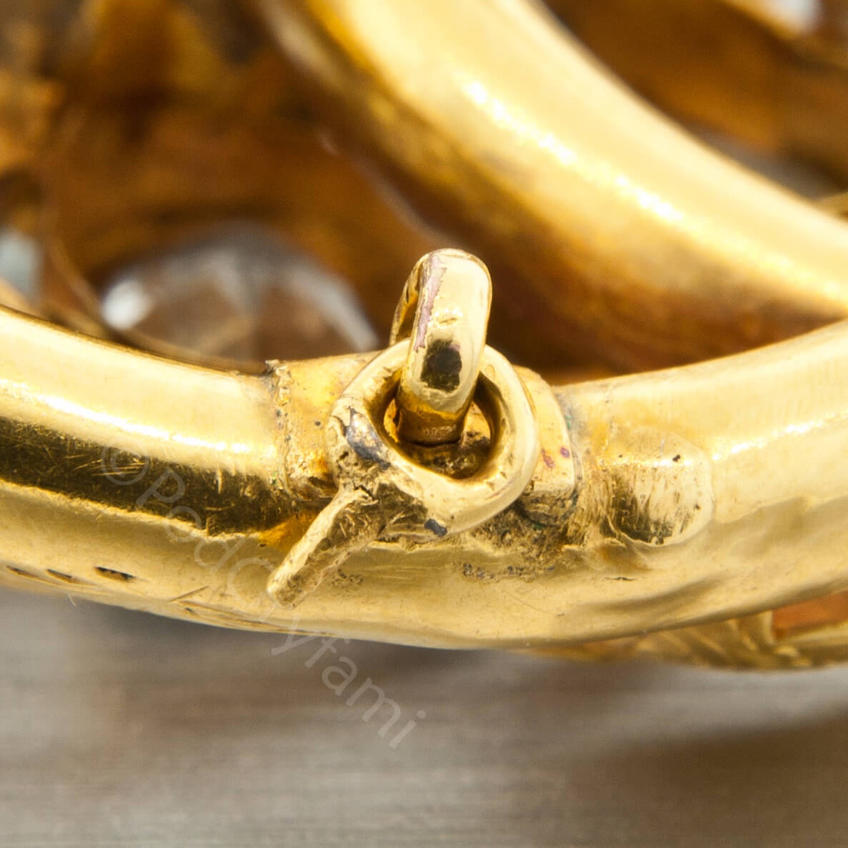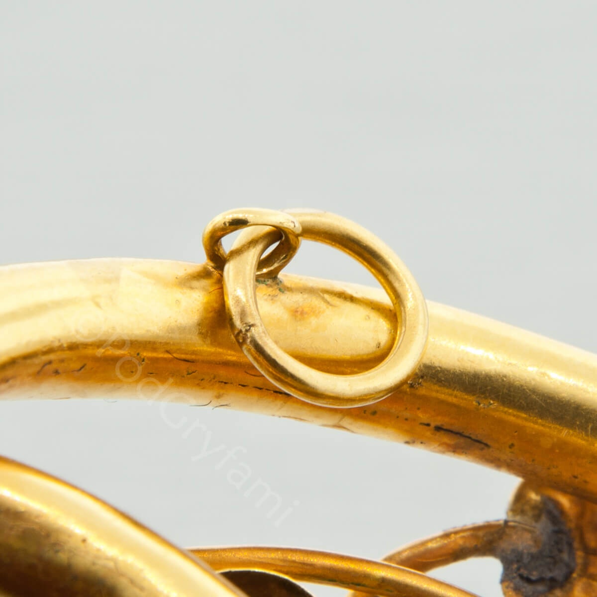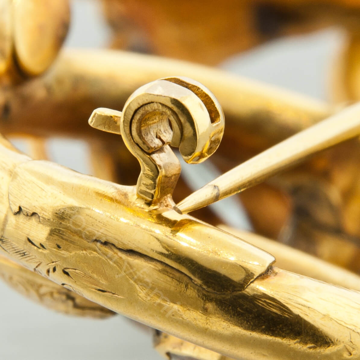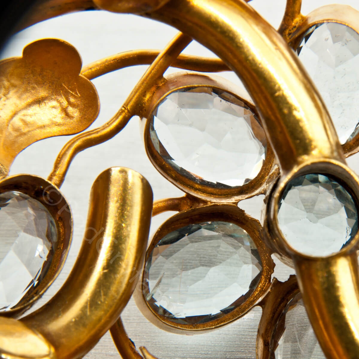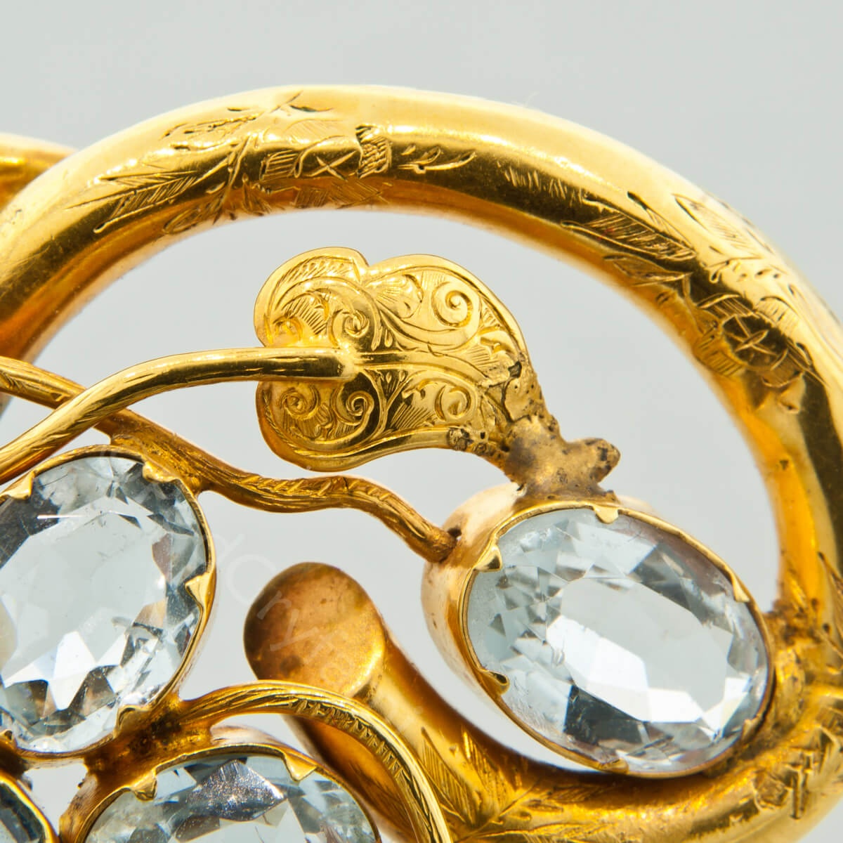 Prezentowana brosza to klasyczny przykład XIX wiecznej biżuterii biedermeierowskiej. Konstrukcja wykonana w złocie dętym, repusowanym w formie wijących się i splatających się ze sobą gałęzi oraz listków spomiędzy, których wyłania się kwiat zdobiony nieprzeciętnej urody bladoniebieskimi akwamarynami. Klejnot można nosić jako broszę lub na łańcuszku, czy też aksamitce jako wisior.