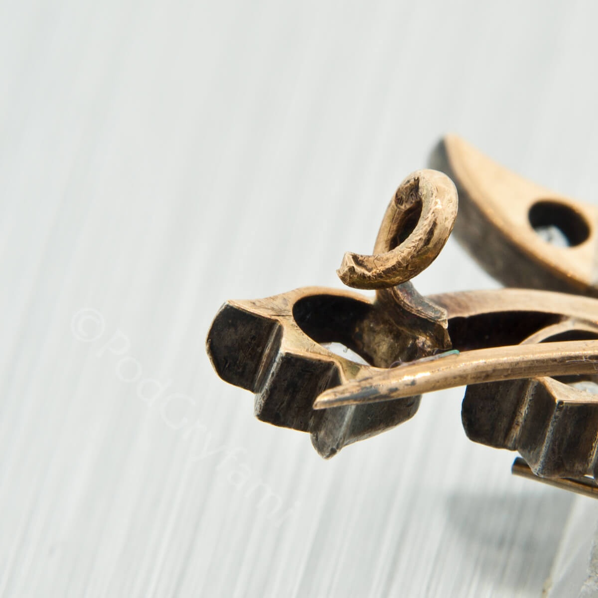 Brosza wykonana w kształcie pojedynczej gałązki konwalii ze srebra werbletowanego złotem. Zarówno kwiaty jak i listki zdobione diamentami w starych szlifach oraz rozetami diamentowymi. Klasyczny przykład biżuterii z okresu secesji doskonale oddający jej nieodparty urok.