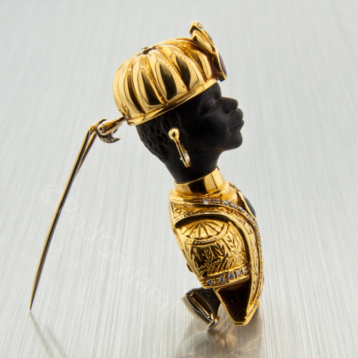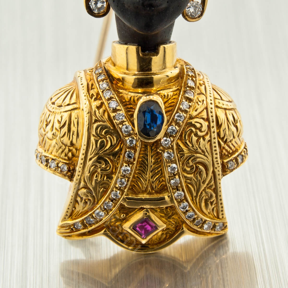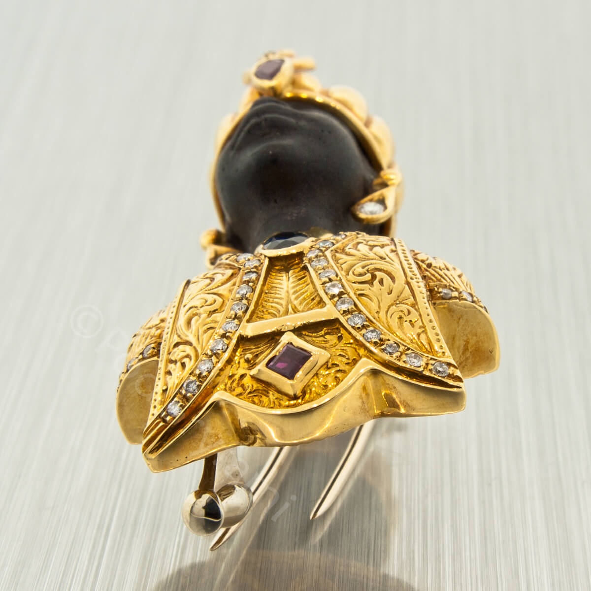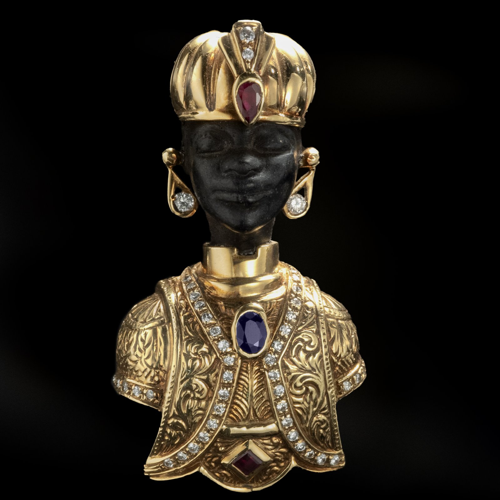 Złoto łączone z hebanem, diamenty, szafir i rubiny.