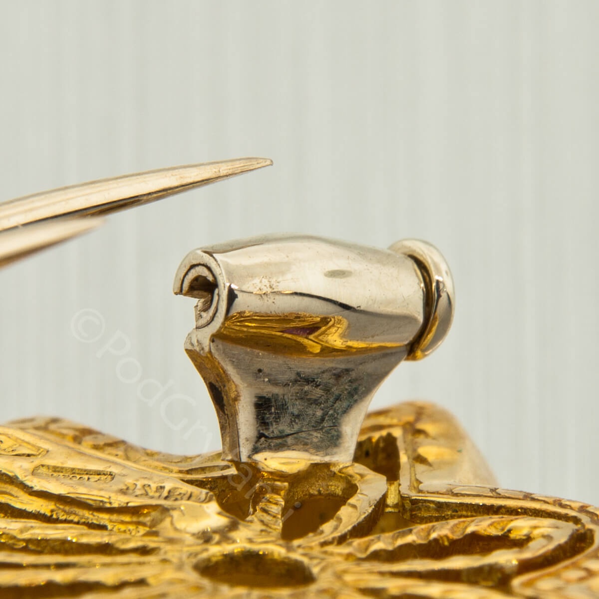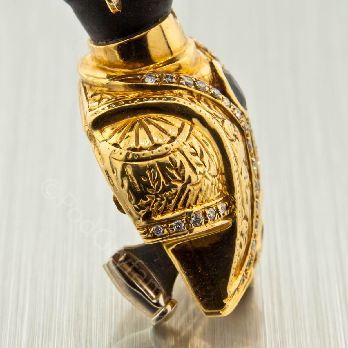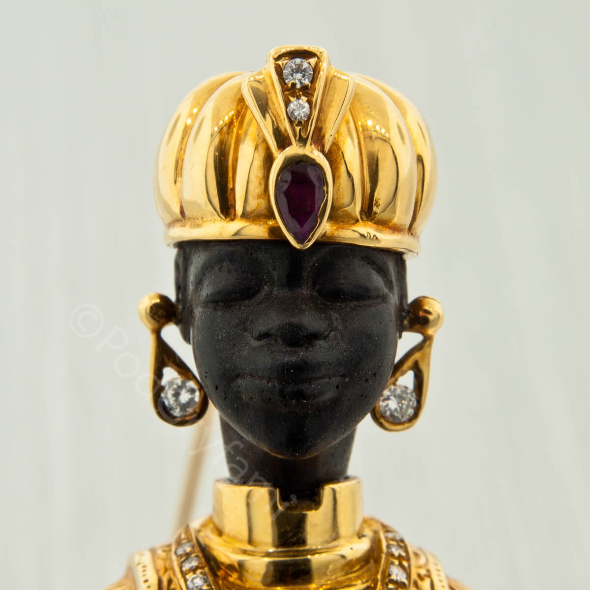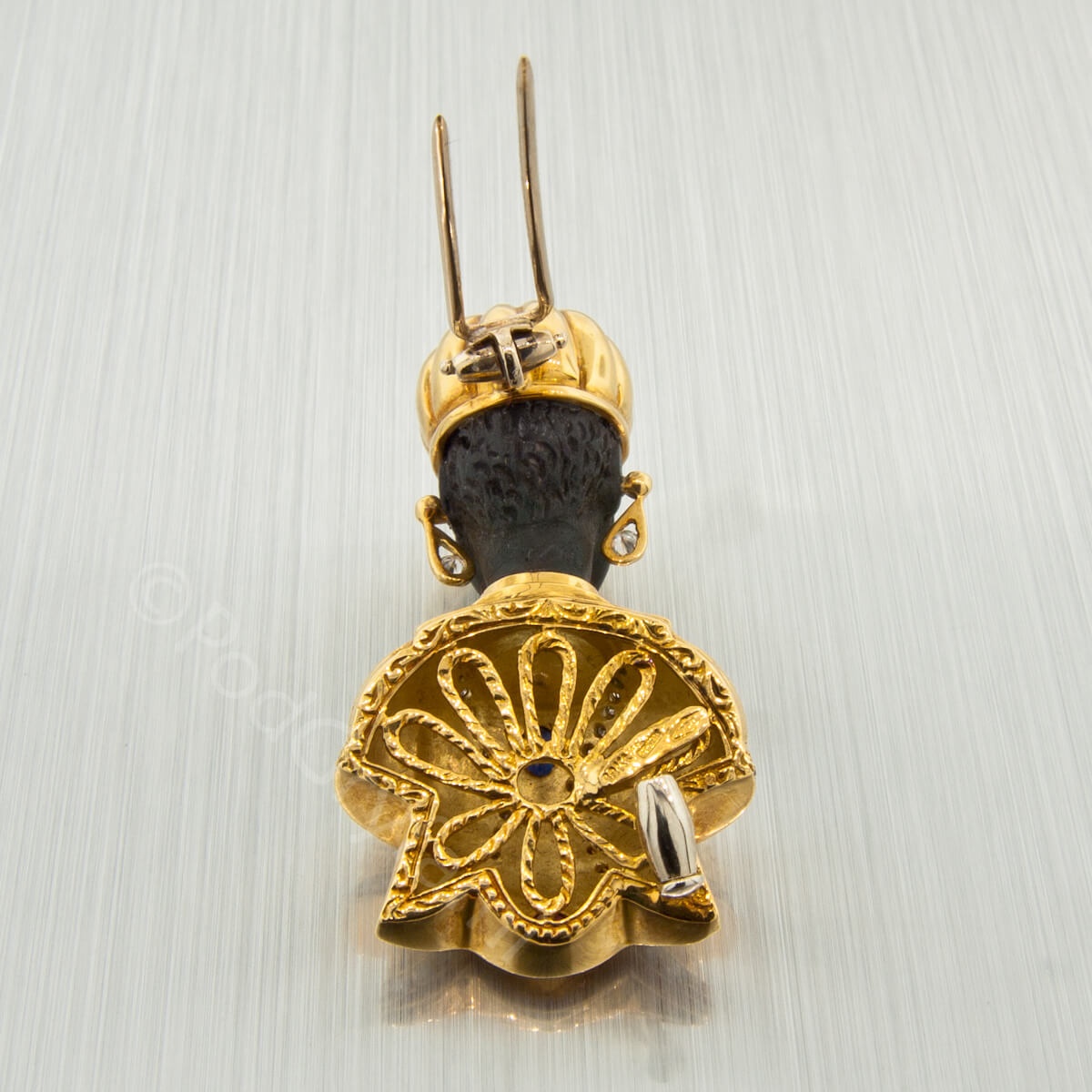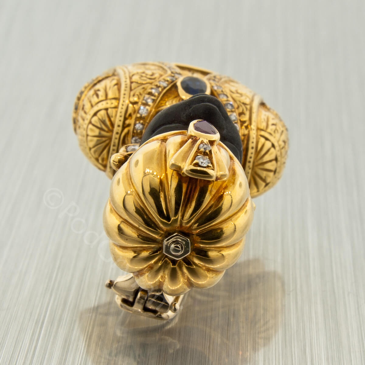 Złoto łączone z hebanem, diamenty, szafir i rubiny.