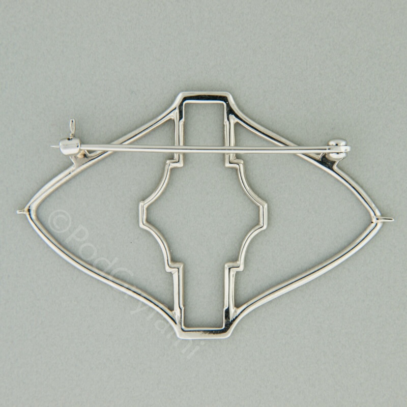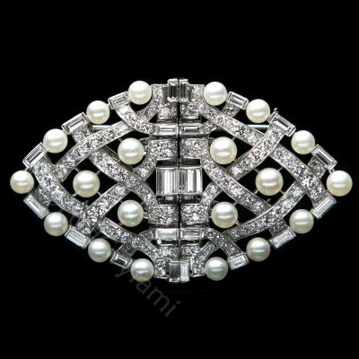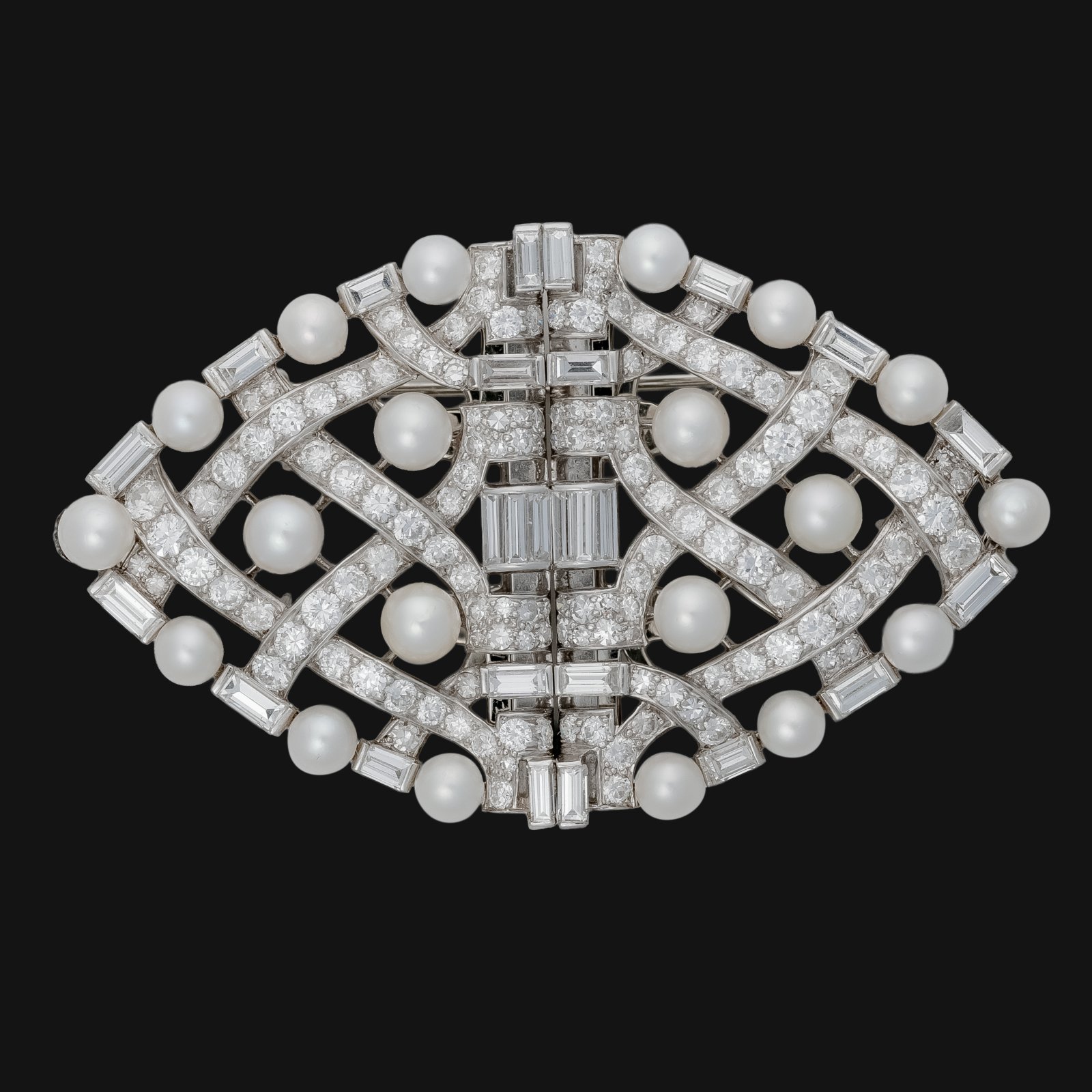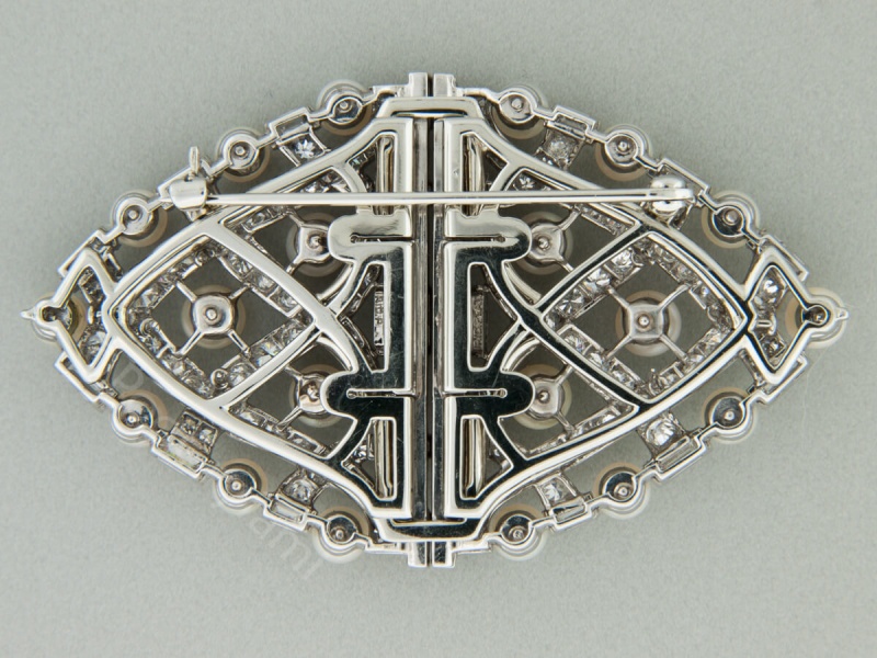 Platinum-gold brooch with diamonds of various shapes (7k). Perfectly selected round diamonds and straight shiny baguettes. In addition, there are twenty silvery white pearls adding a delicate glow. The entire piece can be described as classic elegance, and a special construction allows you to spread the brooch into two parts which can be worn separately.