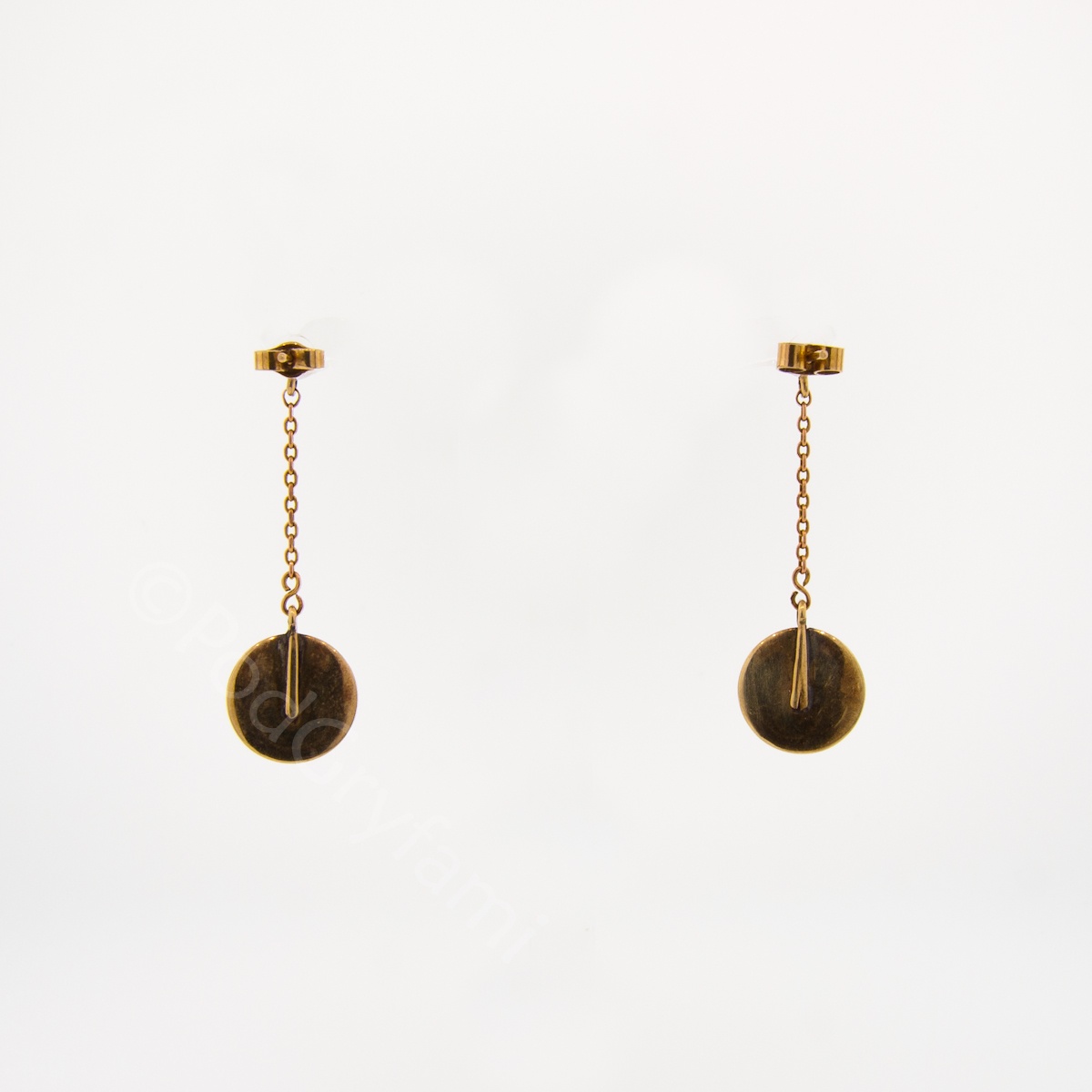 Długie kolczyki wykonane ze złota łączonego ze srebrem. Na delikatnym łańcuszku w oprawie ciągłej osadzony szlifowany w kaboszon granat. W centralnej części granatu umocowany niewielki diament, który swoją delikatną poświatą rozświetla ciemnofioletową barwę tego pięknego minerału.