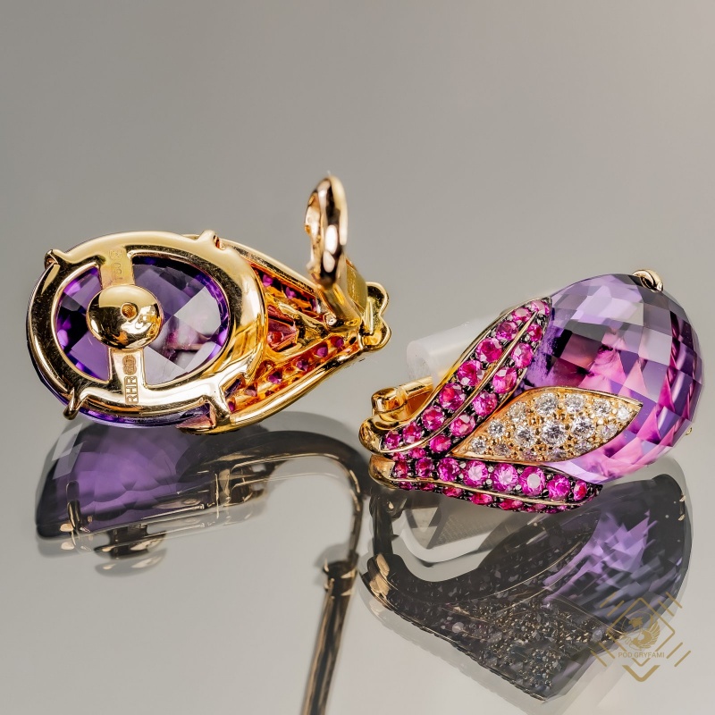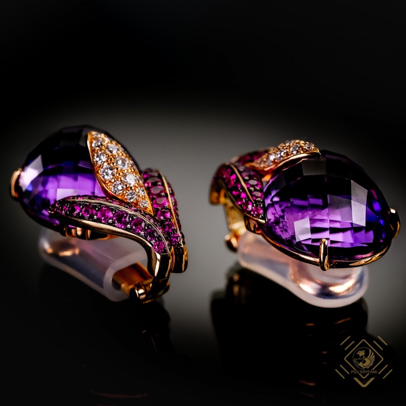 These earrings or rather clips were made in 18 carat gold. In the center is a beautiful shimmering dark purple amethyst. The lower part of the stone is decorated with delicate claws lined with diamonds and extremely rare pink sapphires. This impressive jewel for every occasion has the ability to be tightened and then the clips can be used as earrings.
