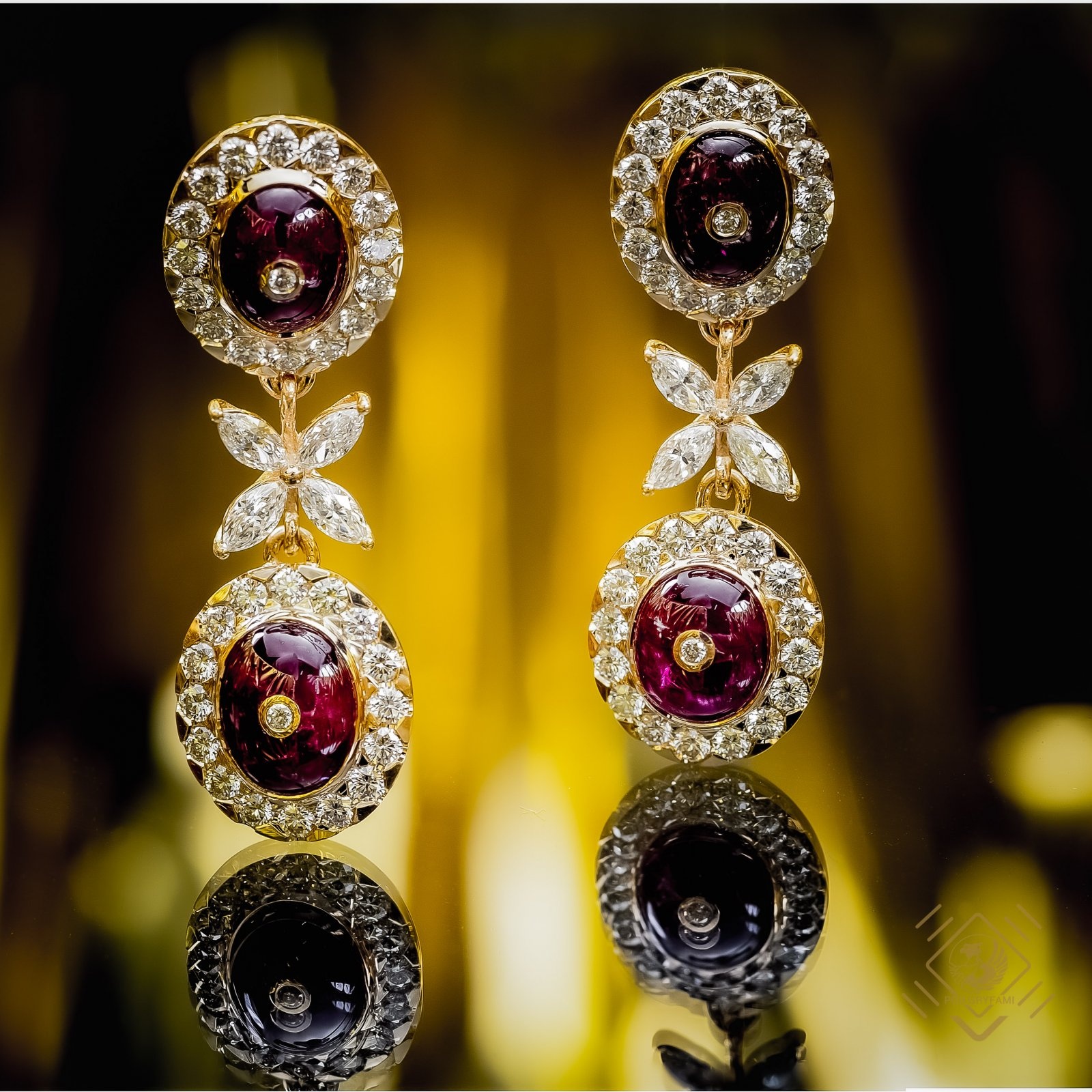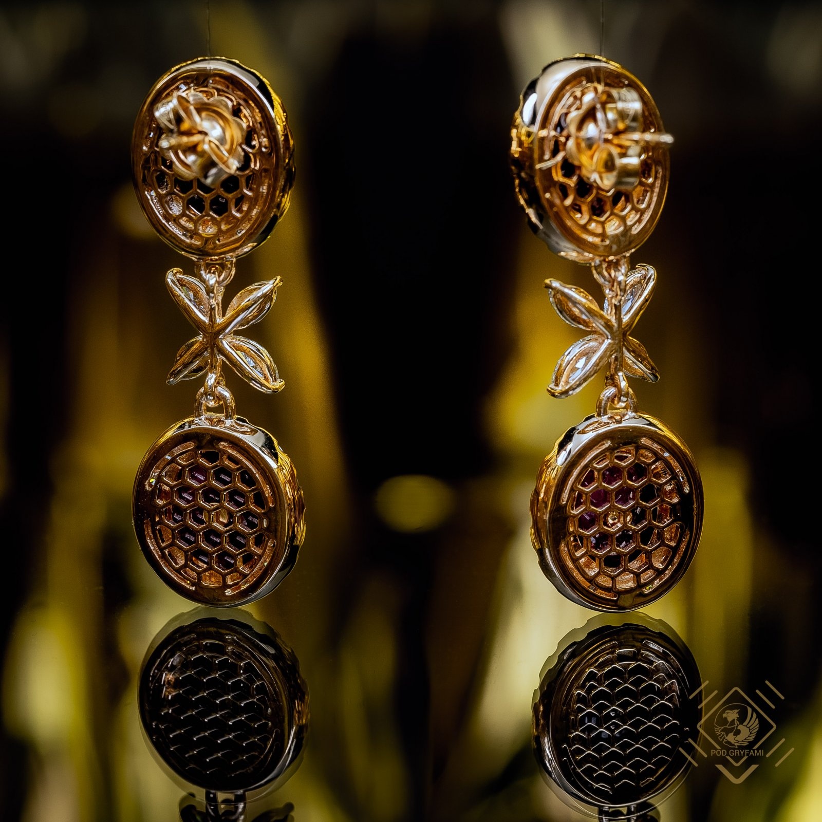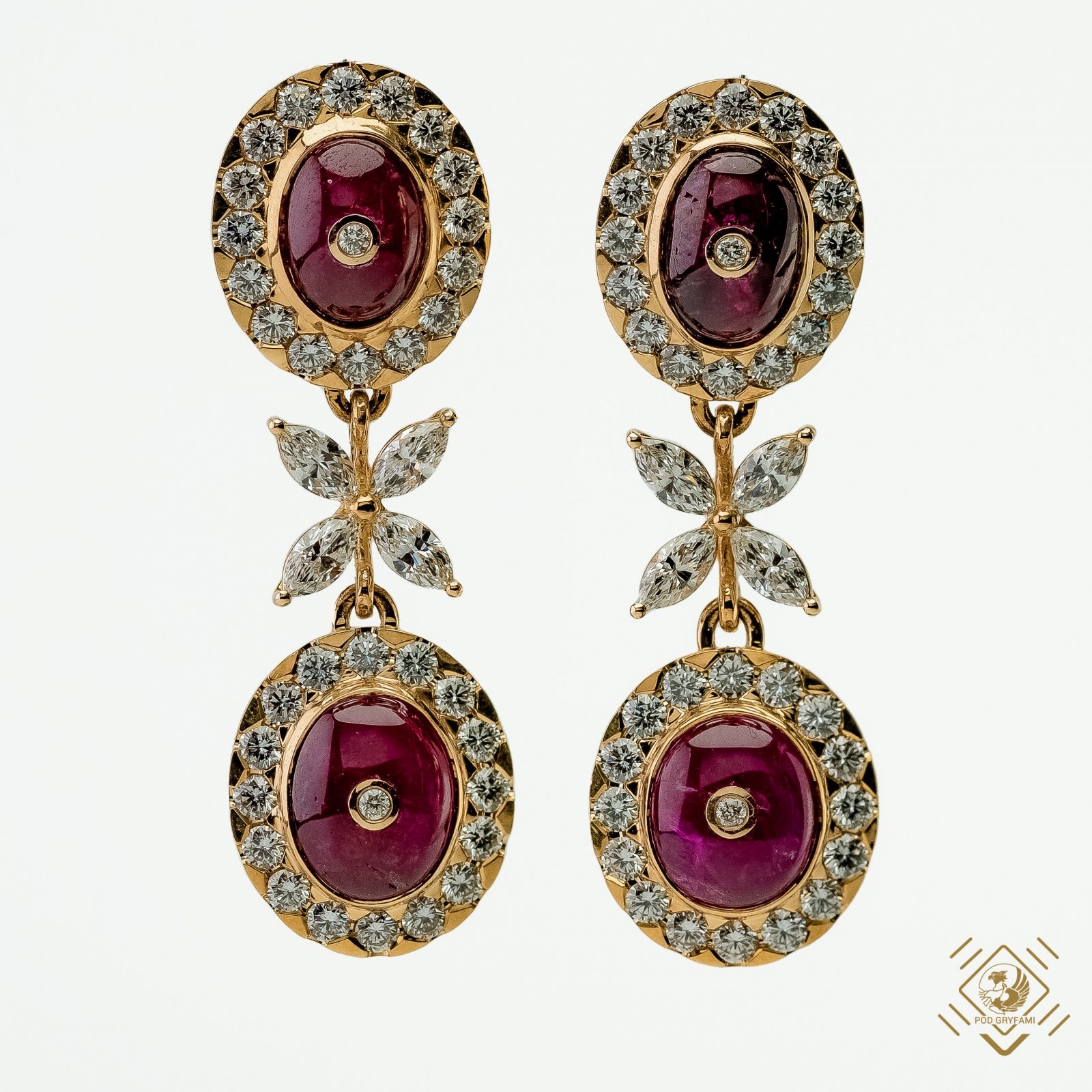 Ekskluzywne, koktajlowe kolczyki wykonane w 18 karatowym złocie. Dwa owalne elementy połączone ruchomym motylkiem ozdobionym diamentami o szlifie markizy. Centralnie osadzone rubiny, których głęboki, nasycony burgund został podkreślony przez połyskujący diamentowy szron. Świetne uzupełnienie wieczorowej kreacji nadające delikatności kobiecej szyi.
