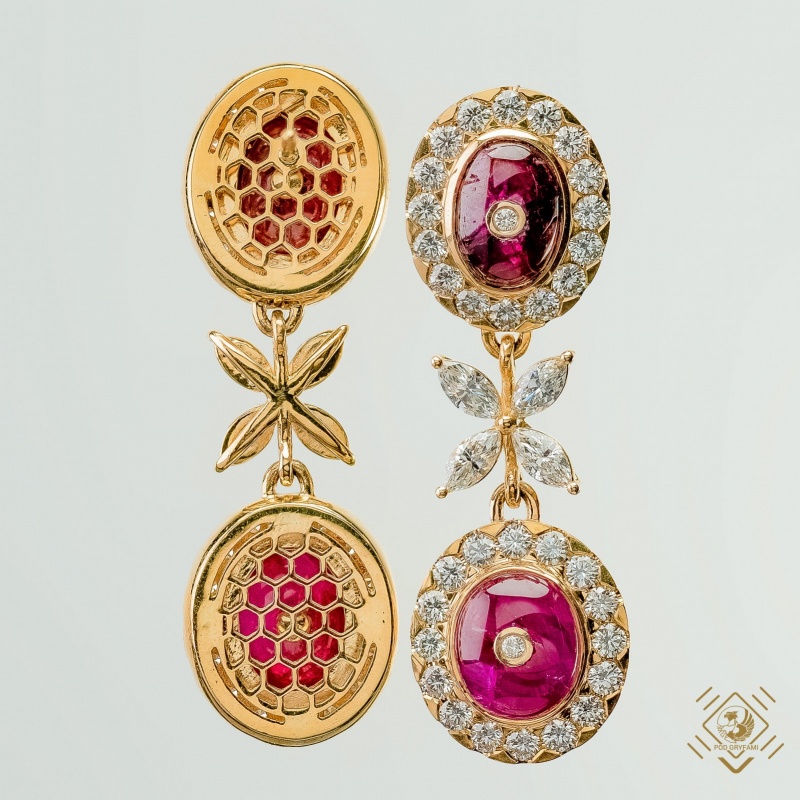 Exclusive, cocktail earrings set in 18 carat gold. Two oval elements connected by a movable butterfly decorated with marquise cut diamonds. Centered rubies, whose deep, saturated burgundy is accentuated by a shimmering diamond frost. A great complement to an evening dress, giving delicacy to a woman's neck.