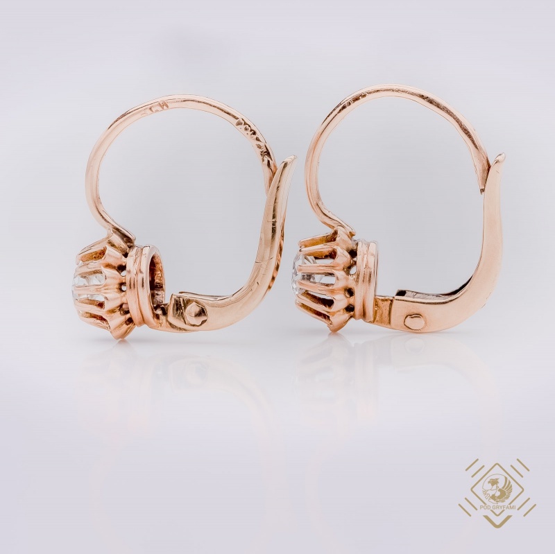 Delicately sparkling Old Mine cut diamonds, in a 14 carat gold prong setting. The shape of the piece harkens back to the beautiful jewelry of the Austro-Hungarian Empire period.