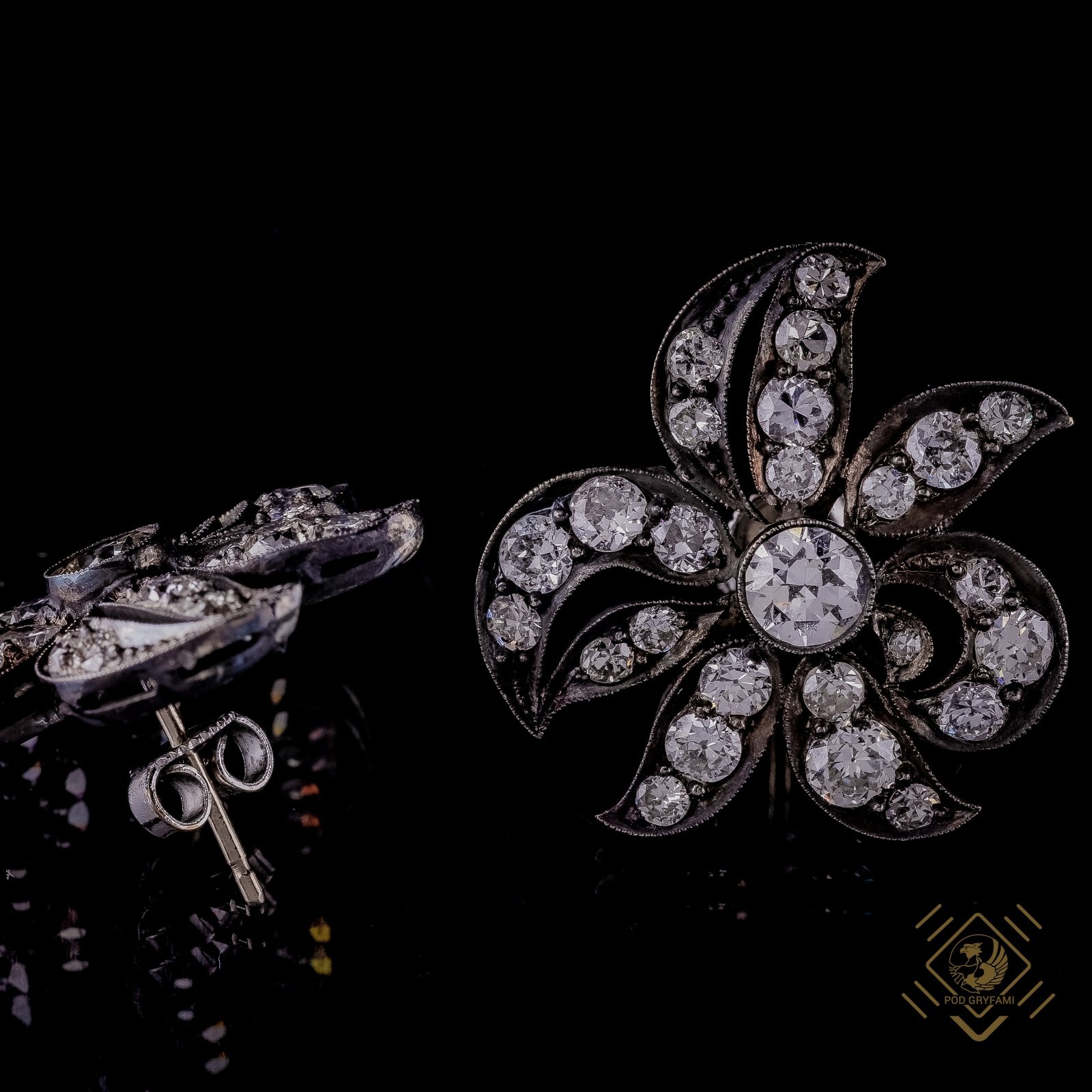 Idealne połączenie diamentów starego szlifu europejskiego ze srebrną oprawą. Wspaniała niezwykle kobieca kompozycja z nutką drapieżności. Ponadczasowy urok oraz niezwykła z pozoru niedbała a jednak bardzo precyzyjna praca złotnicza.
