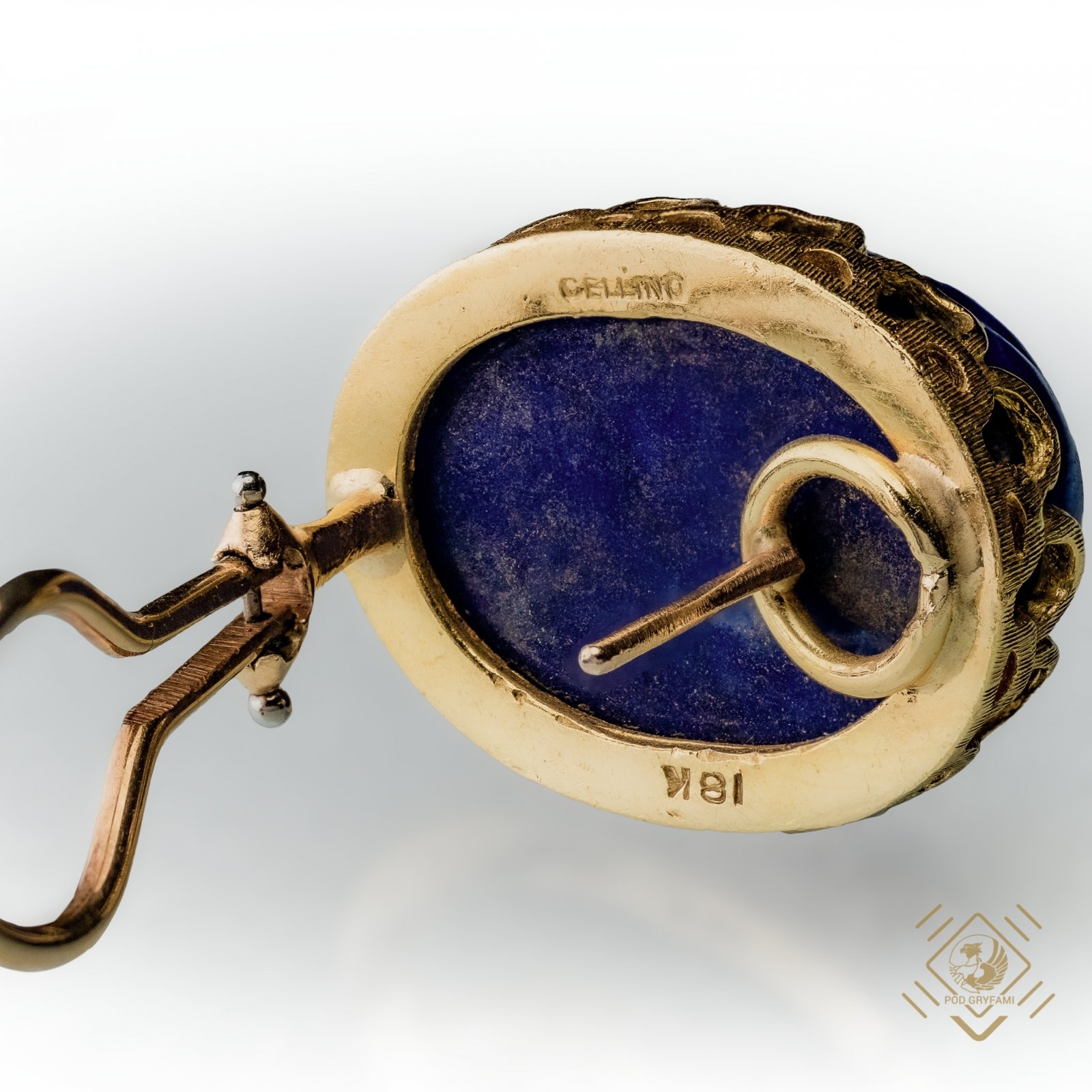 Ulubiona dekoracja włoskiego renesansu ornament godronowy posłużył mistrzowi jubilerstwa do wykonania tej niezwykłej pary kolczyków. W delikatnej złotej koronce pyszni się wspaniały lapis lazuli - lazuryt o głębokiej barwie ciemnego granatu z niewielkimi inkluzjami pirytowymi w kolorze starego złota. Urodę kamieni podkreśla fryz godronowy.