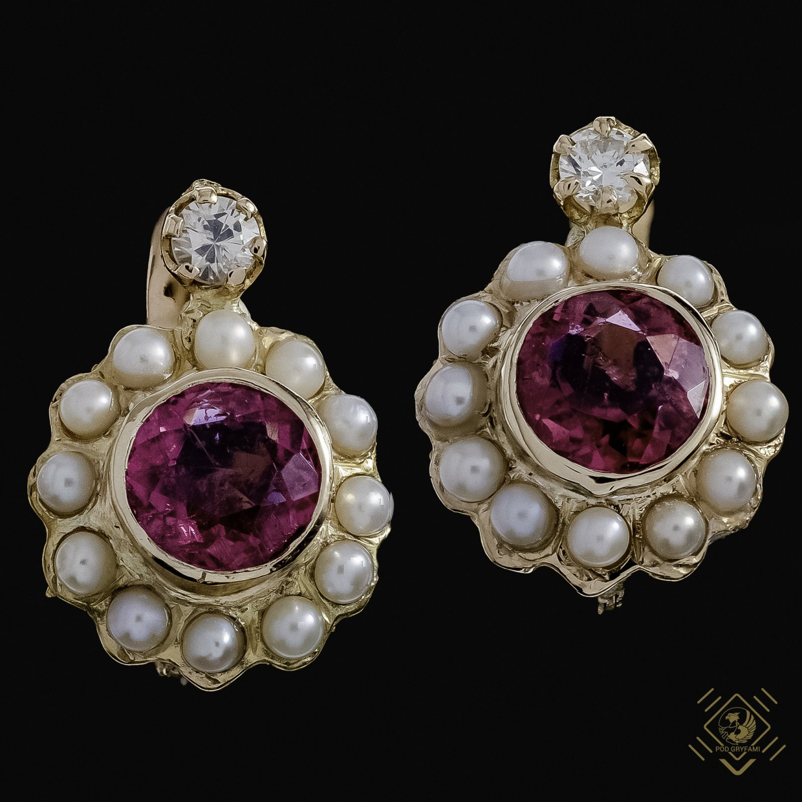 Kolczyki z rubelitami, diamentami oraz perełkami