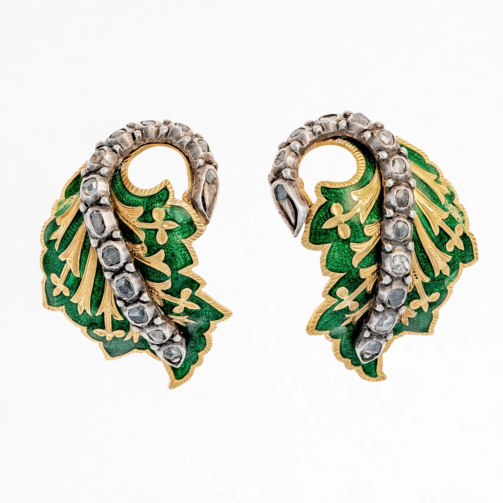 Złota konstrukcja w formie liścia ozdobiona delikatną emalią w głęboko nasyconej barwie żywej zieleni. Środek każdego listka wypełnia rządek delikatnie połyskujących rozet diamentowych oprawionych w srebro. Puszczając wodze fantazji zamiast listów możemy również zobaczyć dwa baśniowe smoki z delikatnie zwiniętymi skrzydłami. Absolutnie wysokiej klasy rękodzieło mistrzów złotniczych minionej epoki.