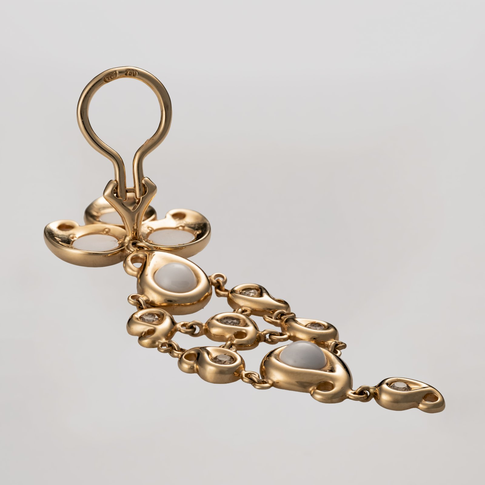 Wspaniały projekt o lekko romboidalnym kształcie wykonany w złocie. Ruchome miękko zakończone elementy połączone niewielkimi, złotymi ogniwami zdają się płynąć przy każdym ruchu głowy. Całość dekorują diamenty w szlifie brylantowym oraz obłędnie piękne opale lechosos (z hiszpańskiego - mleczny ).