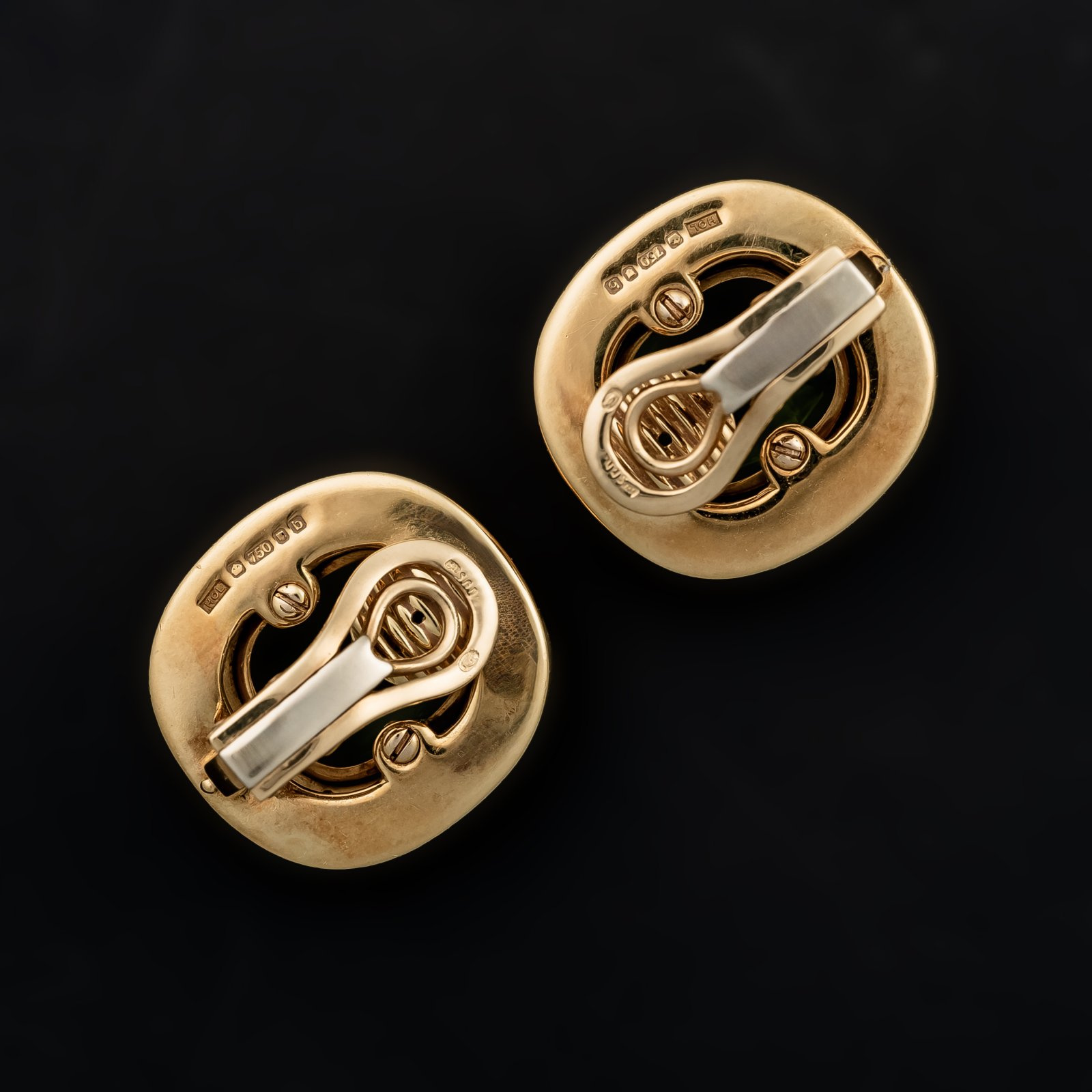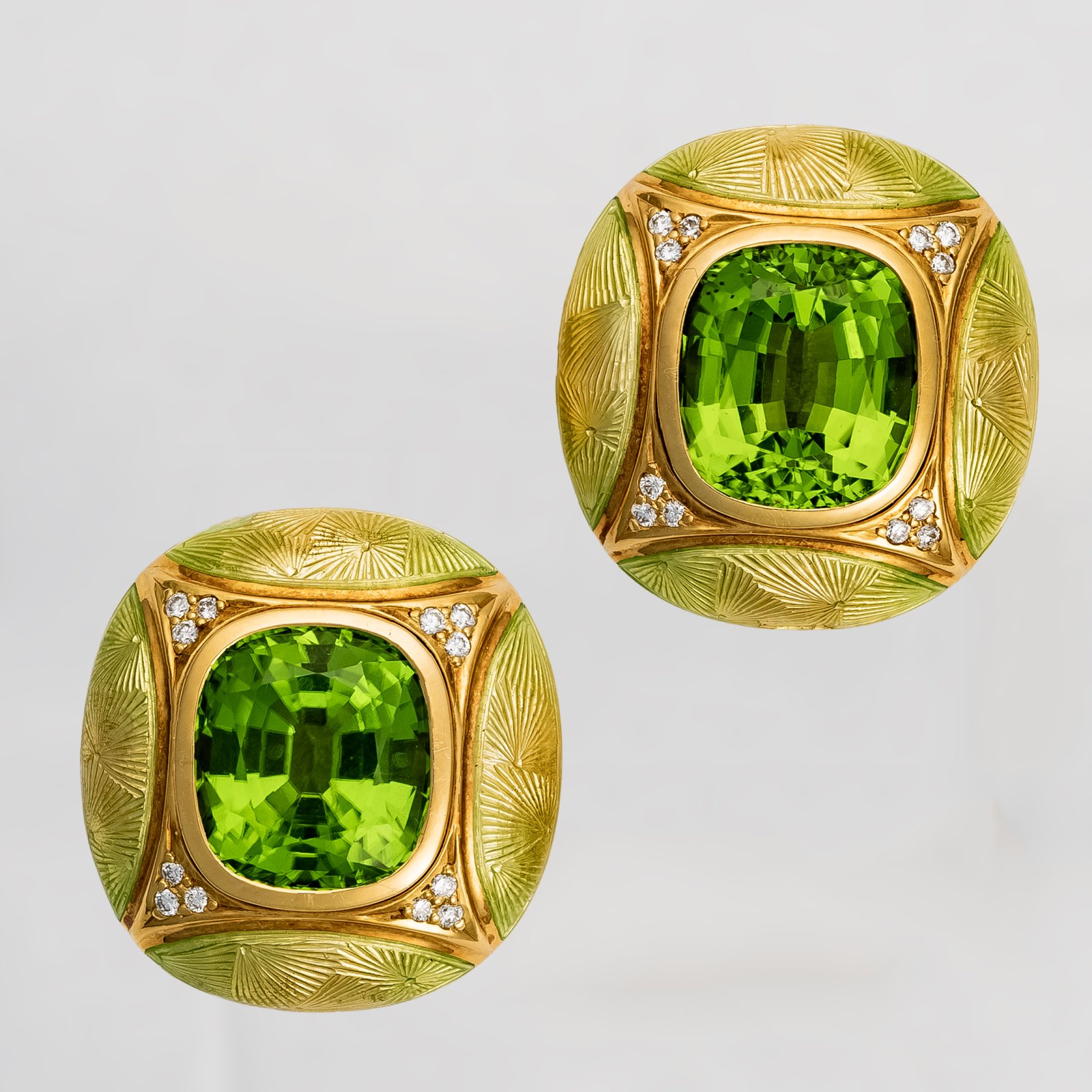 Wspaniały design drugiej połowy lat 70-tych XX wieku. Niepowtarzalne , bogato fasetowane perydoty ujęte w złotą oprawę delikatnie muśniętą seledynową emalią. Dodatkowy dekor stanowią niewielkie diamenty wpisane w romboidalną formę. Głęboka zieleń perydotów - szlachetnej odmiany oliwinów w zestawieniu z barwą ciepłego złota daje niesamowity wizualny efekt. Klipsy zaopatrzone w komplet punc angielskich z dokładnym określeniem daty powstania.
