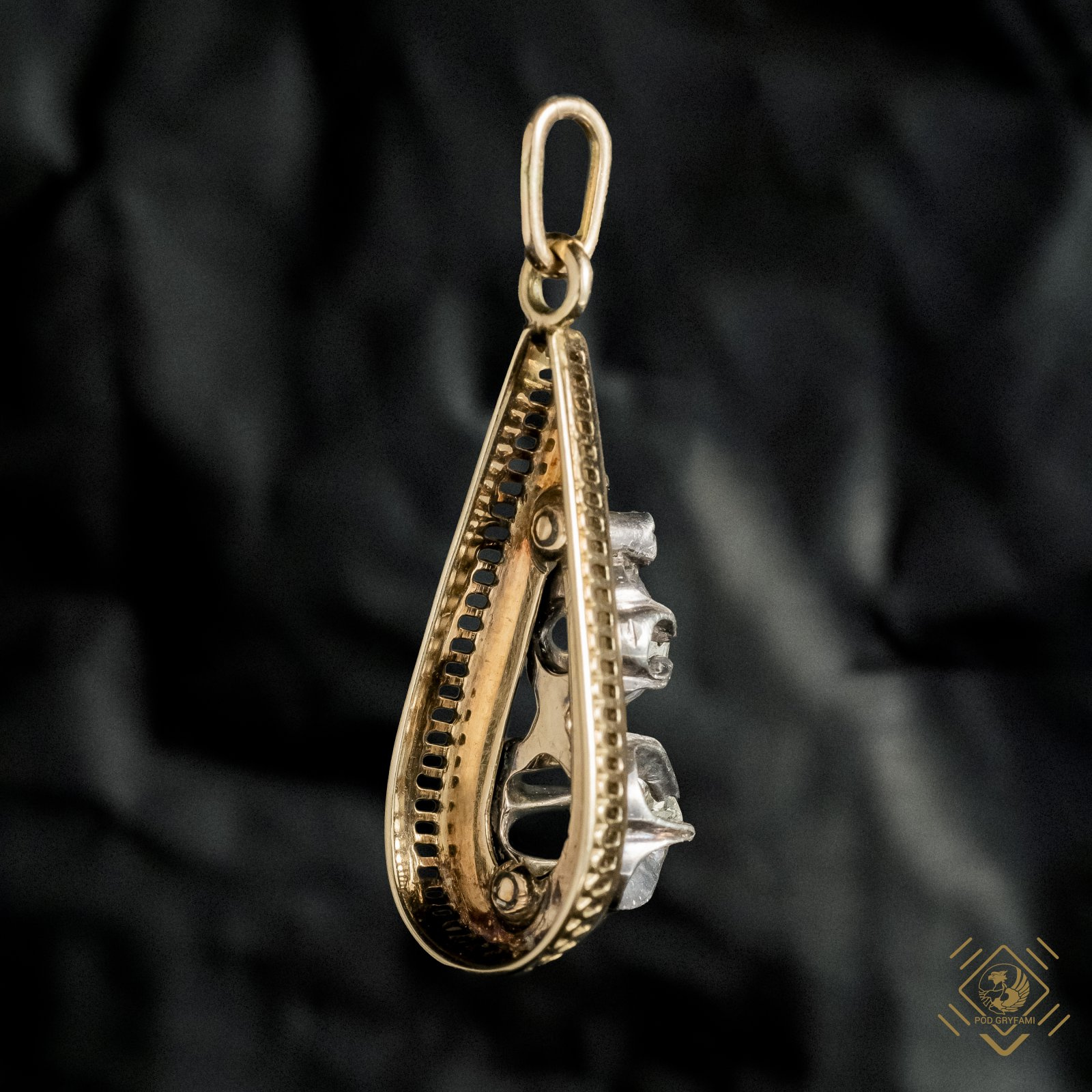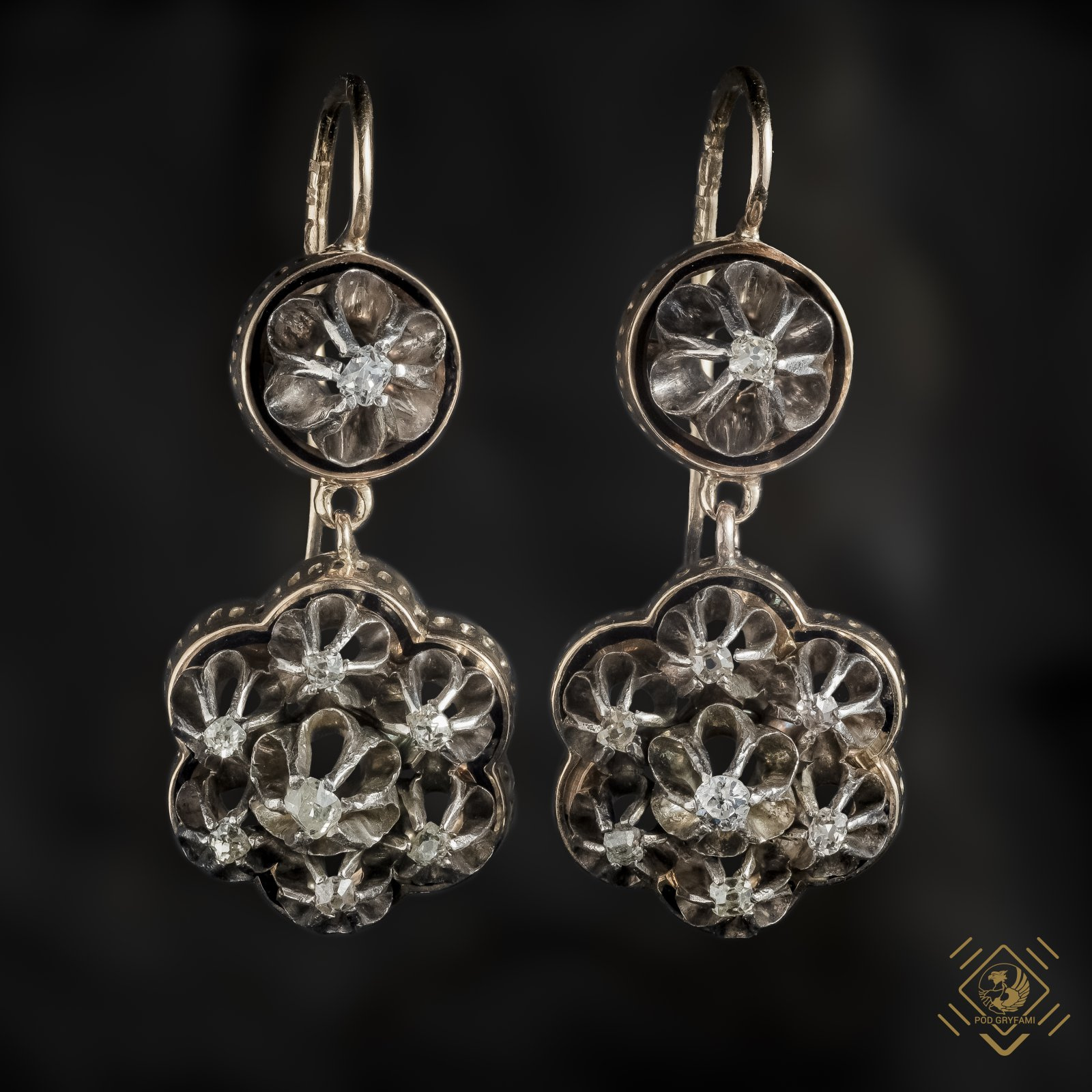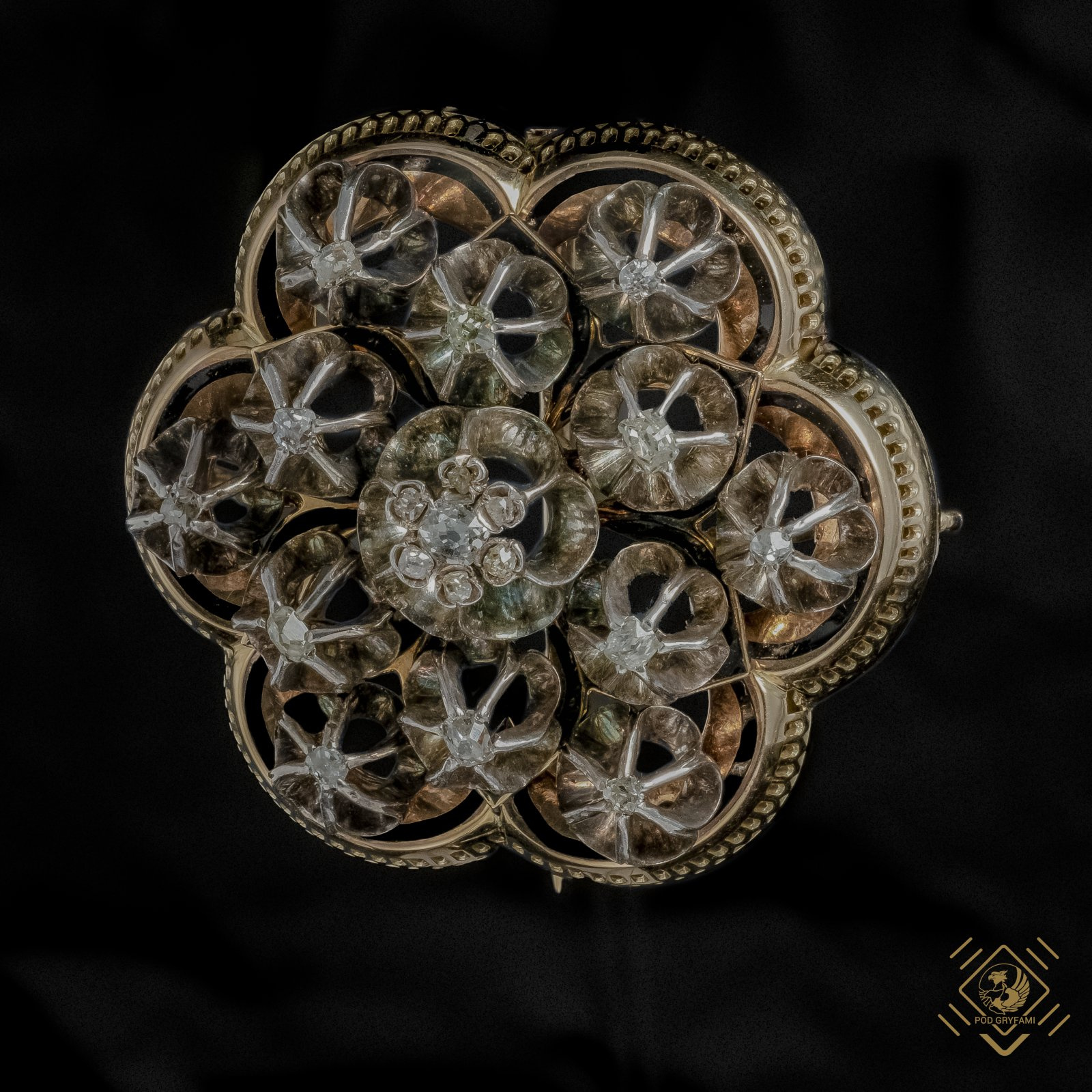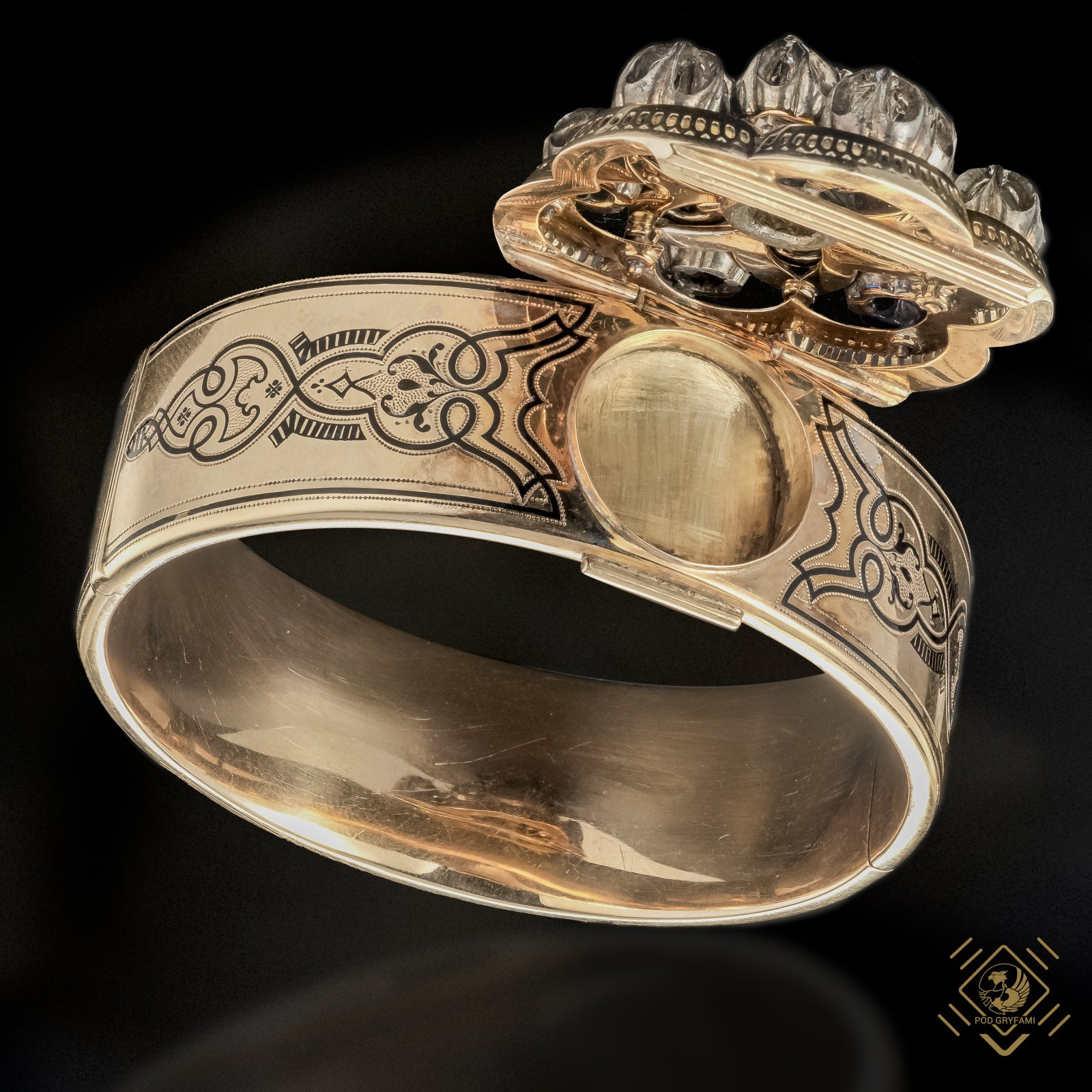 Unikatowy komplet biżuterii składający się z okazałej bransolety z ukrytym sekretnikiem, broszy, kolczyków i wisiora. Całość wykonana w złocie ozdobiona diamentami w starych szlifach old square cushion cut, old mine cut oraz rozet. Kamienie oprawione w srebro. Ornamentyka floralna tworząca w konstrukcji niewielkie ażurowe kwiaty. Dodatkowo bransoleta dekorowana niellem. Majstersztyk ręcznej pracy złotniczej opatrzonej polskimi puncami lombardowymi bitymi do 1950 roku.