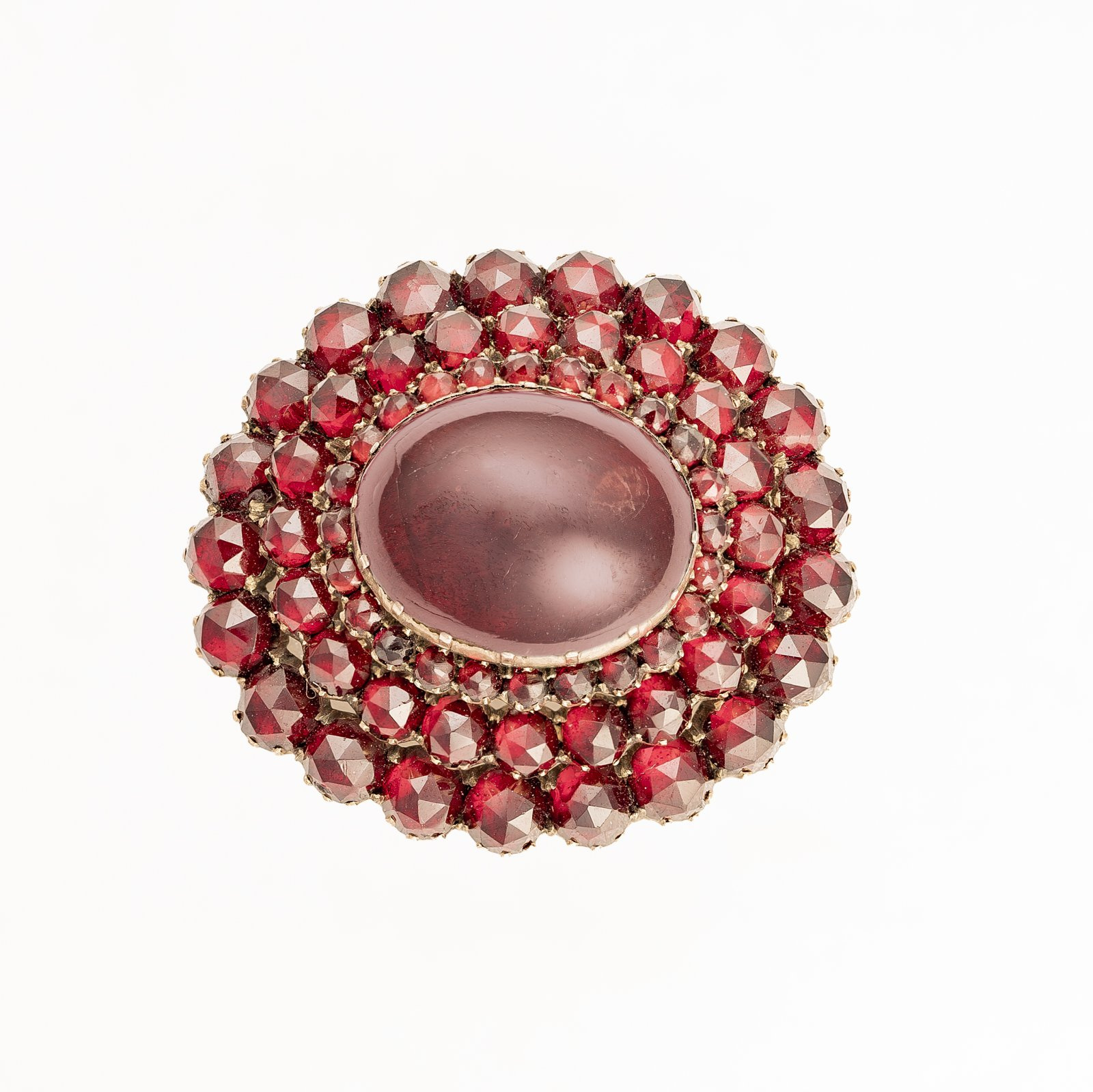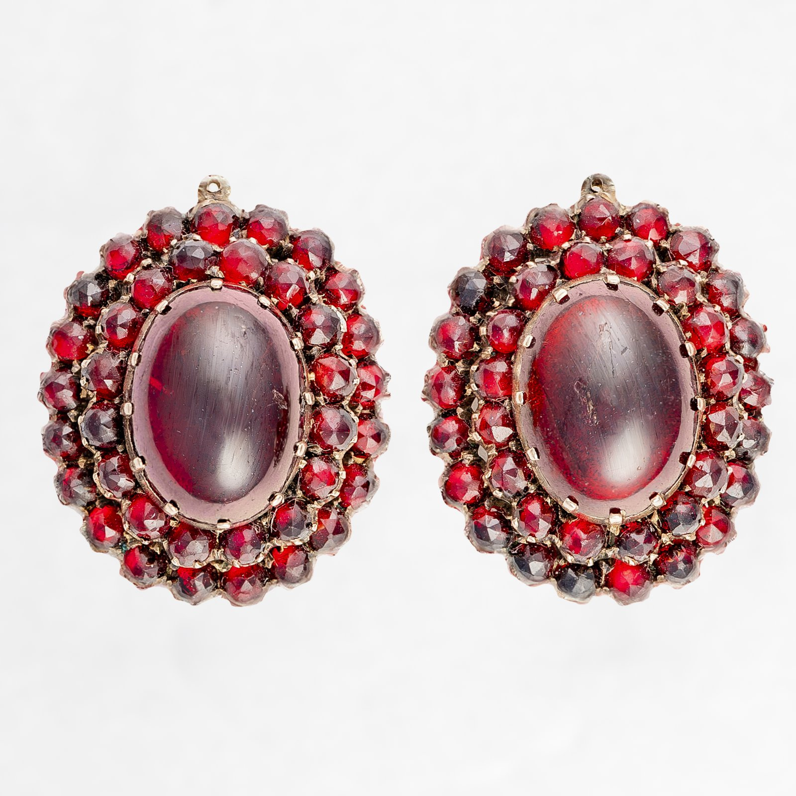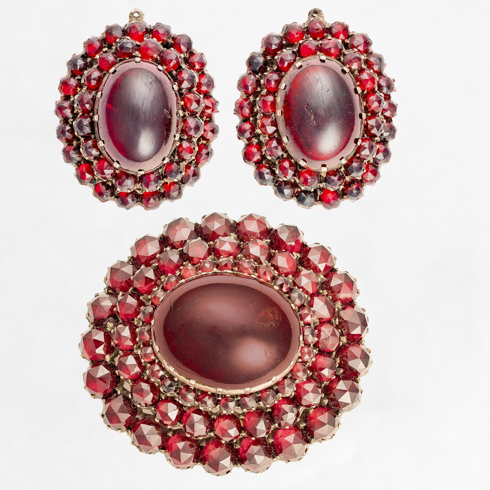 Niezwykle piękne demi parure z granatami. W starej oprawie typu abgedeckt ( przykrywająca kamień ), kasetowej, zamkniętej wykonanej ze złota ujęte wspaniałe granaty w szlifie pojedynczych kaboszonów oraz w starych szlifach wysokich rozet. Komplet znakomicie wpisuje się w nurt biżuterii sentymentalnej drugiej połowy XIX wieku. Kunszt pracy złotniczej oraz żywy ognień granatów w kolorze ciemnego burgunda zadowoli z pewnością niejedną miłośniczkę romantycznych precjozów z granatami.