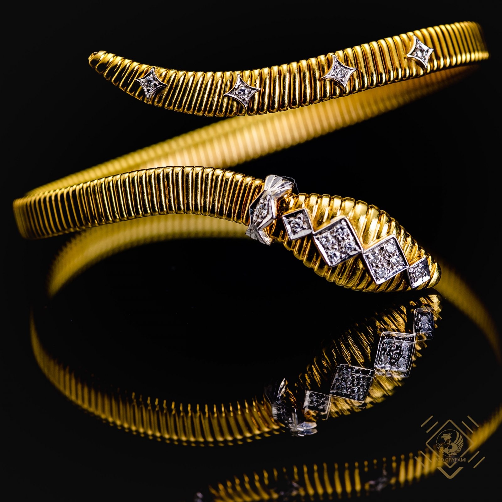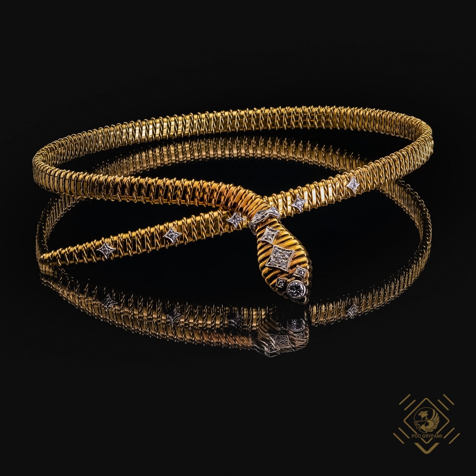 Efektowny naszyjnik i bransoleta wykonane z 18 karatowego złota dekorowane diamentami. Niewątpliwym atutem biżuterii jest jej sprężystość, która sprawia, że zarówno naszyjnik jak i bransoleta pasują na każdą szyję i przegub dłoni. Dodatkowo motyw węża chętnie wykorzystywany w projektach biżuterii czyni z kompletu ,,łakomy kąsek" dla kolekcjonerów.