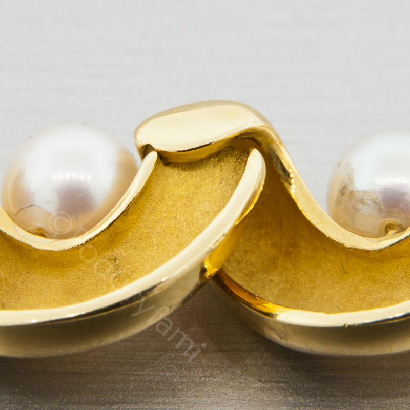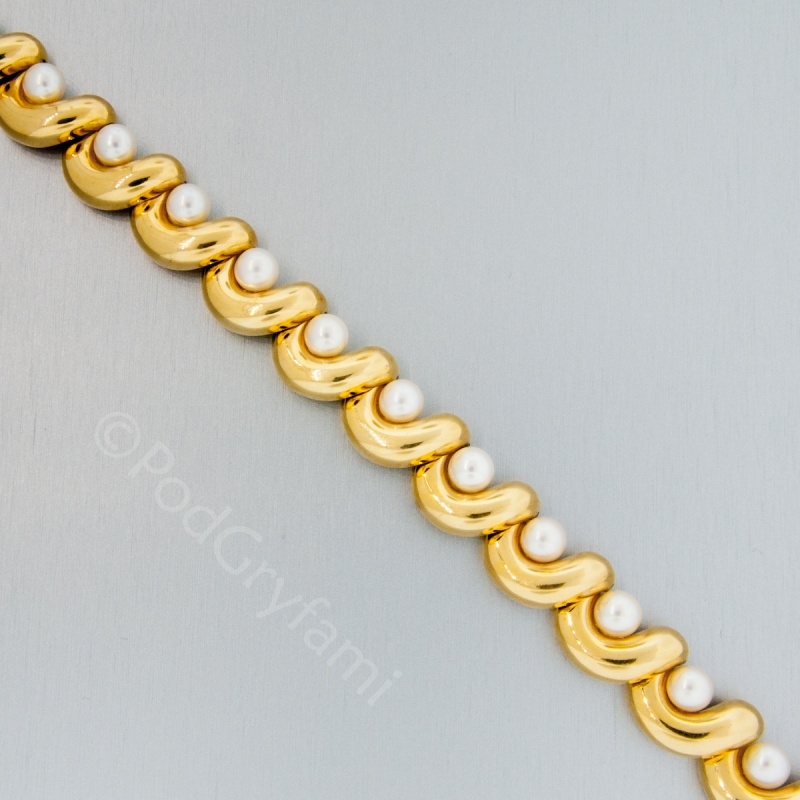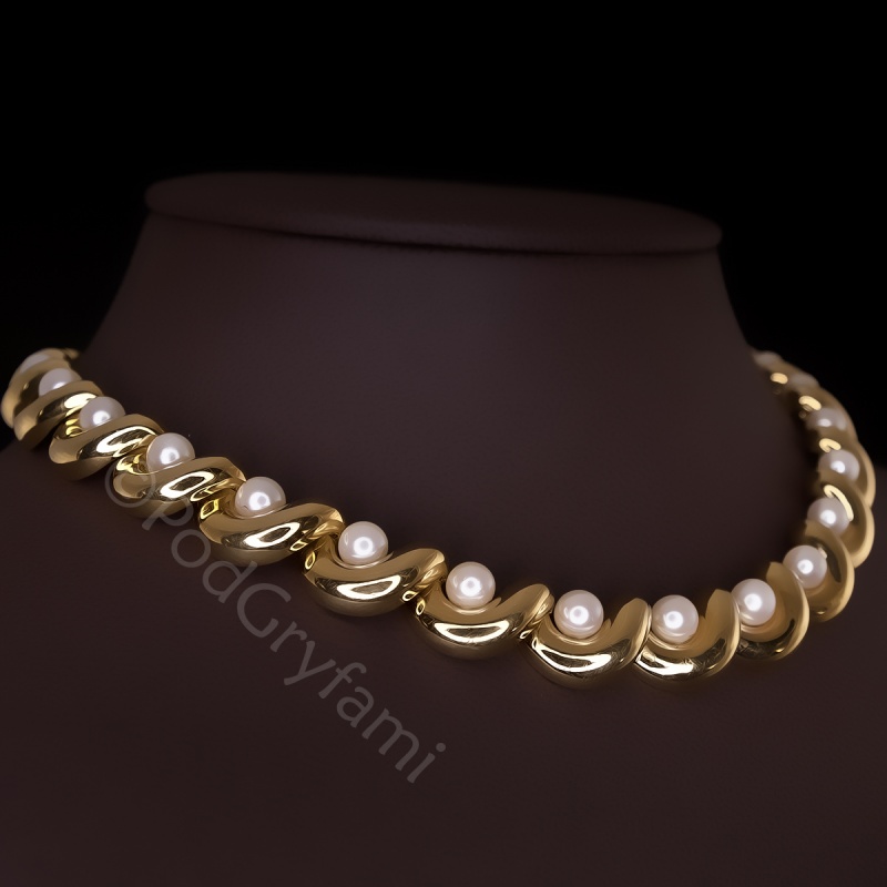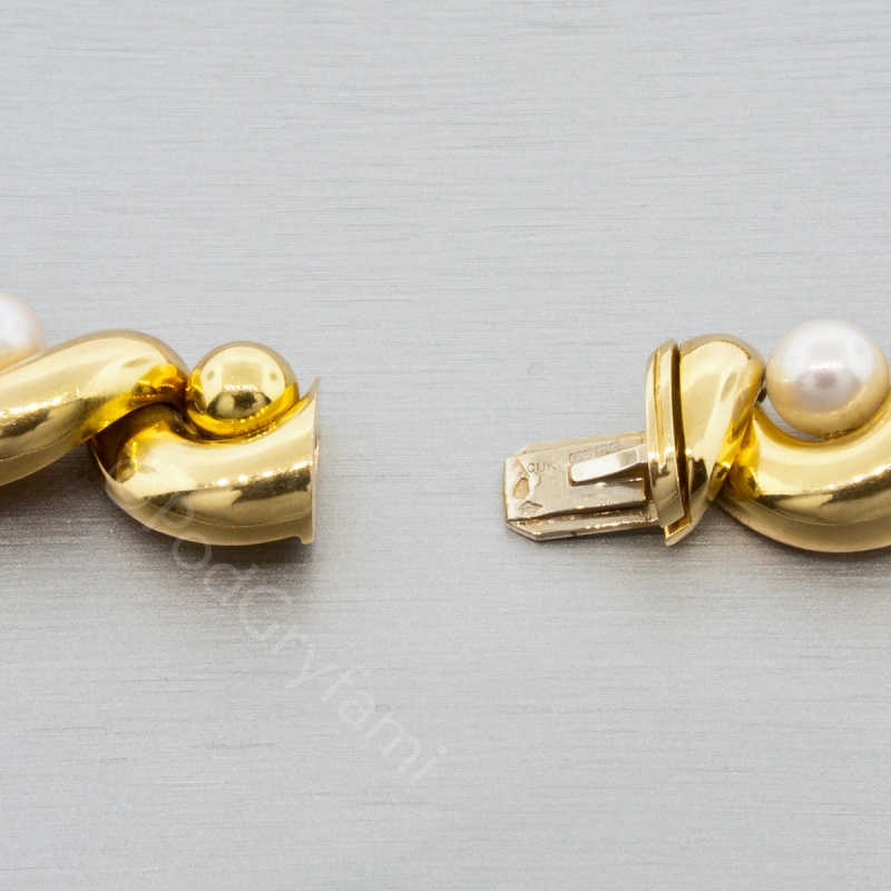 18 carat gold necklace in the form of horseshoes, each of which is decorated with a perfectly matched round, creamy pearl. The jewel, taking its stylistic cues from La Belle Epoque, is classic and elegant.
