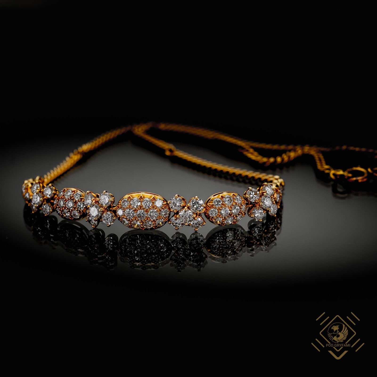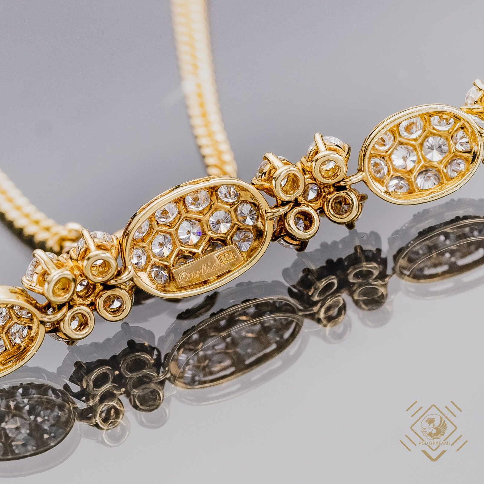 delikatny wykonany z 18 karatowego złota łańcuszek ozdobiony ułożonymi naprzemiennie owalnymi i krzyżykowymi elementami wysadzanymi niewielkimi okrągłymi diamentami. Połyskujący lśniącymi diamentami klejnot to wysokiej jakości wyrób znanej na całym świecie maki jubilerskiej Cartier.