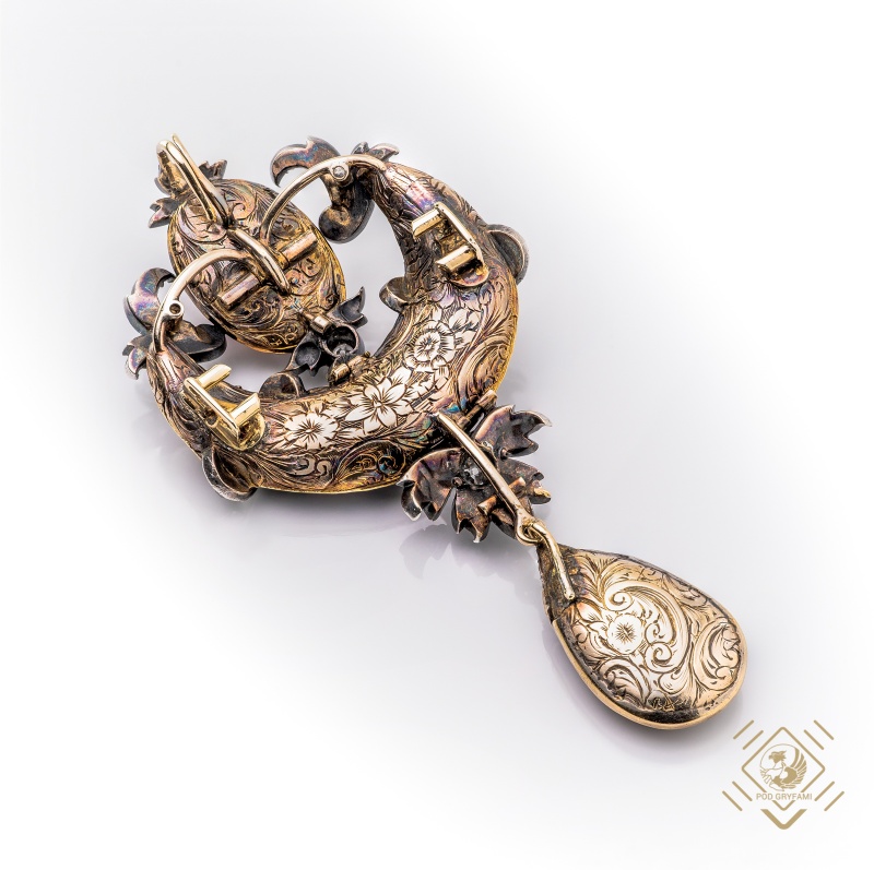 A rare historical specimen with an unusual combination of garnets, diamonds and diamond rosettes in a beautifully chiseled setting with plant motifs. A masterpiece emphasizing the artistry of 19th century goldsmiths.