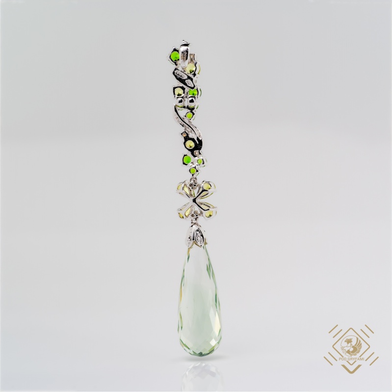 Delicate, very feminine pendant, given particular charm with a teardrop celadon quartz stone. The briolette cut beautifully disperses the light, and focuses all our attention on this unusual stone. The briolette cut is one of the most difficult to execute correctly. This simple piece with its delicate green, shows true artistry.