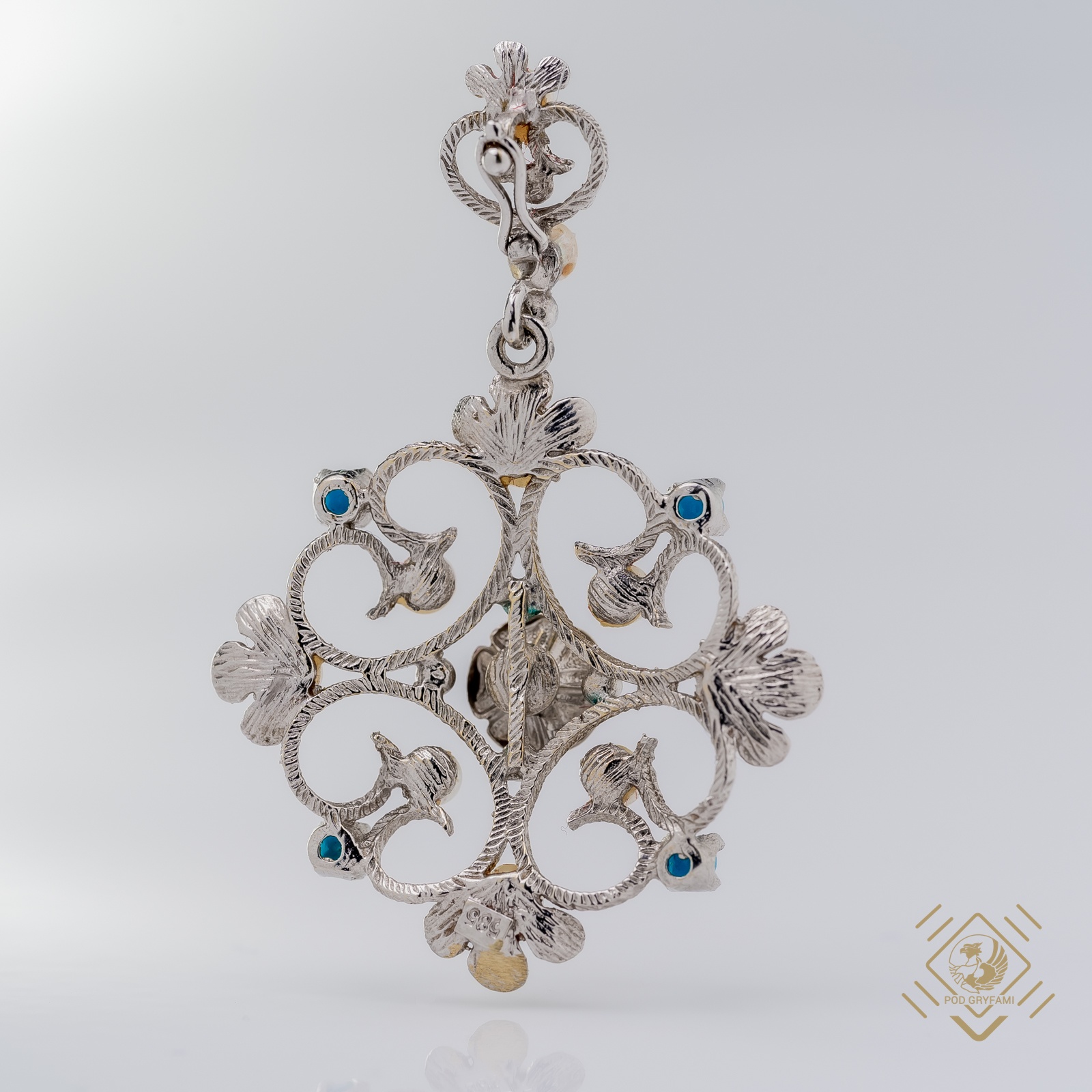 Uroczy, bardzo kobiecy drobiazg. Piękna fantazyjna forma z kwiatowym akcentem wykonana z białego złota, ozdobiona niewielkimi perełkami i turkusami.