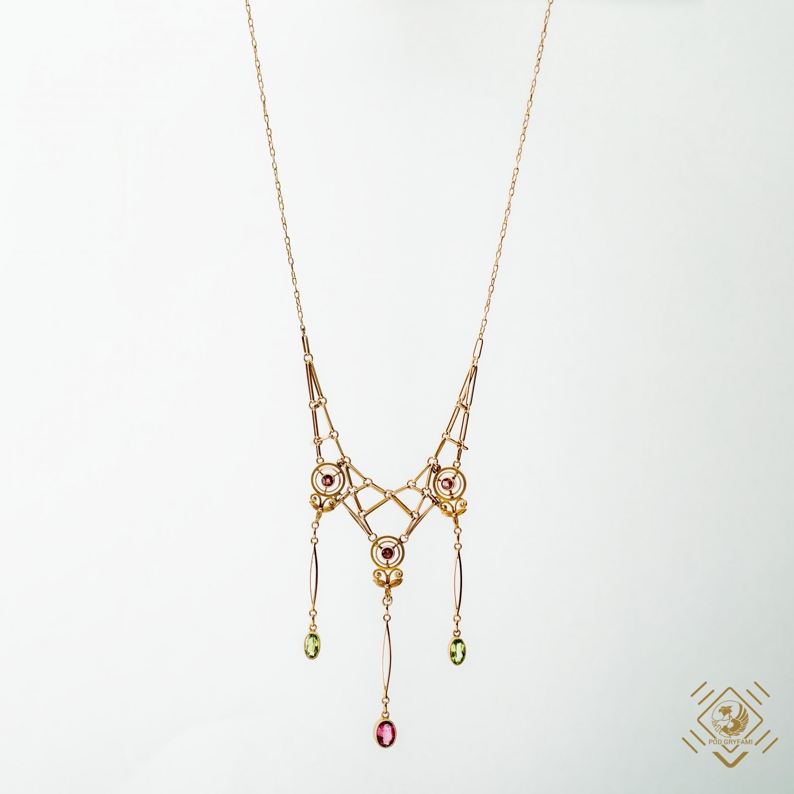 Delikatny secesyjny wzór, ozdobiony turmalinami i oliwinami niczym pajęczynka otuli kobiecy dekolt. Pełen wdzięku i fantazji sprosta najbardziej wyszukanym gustom.