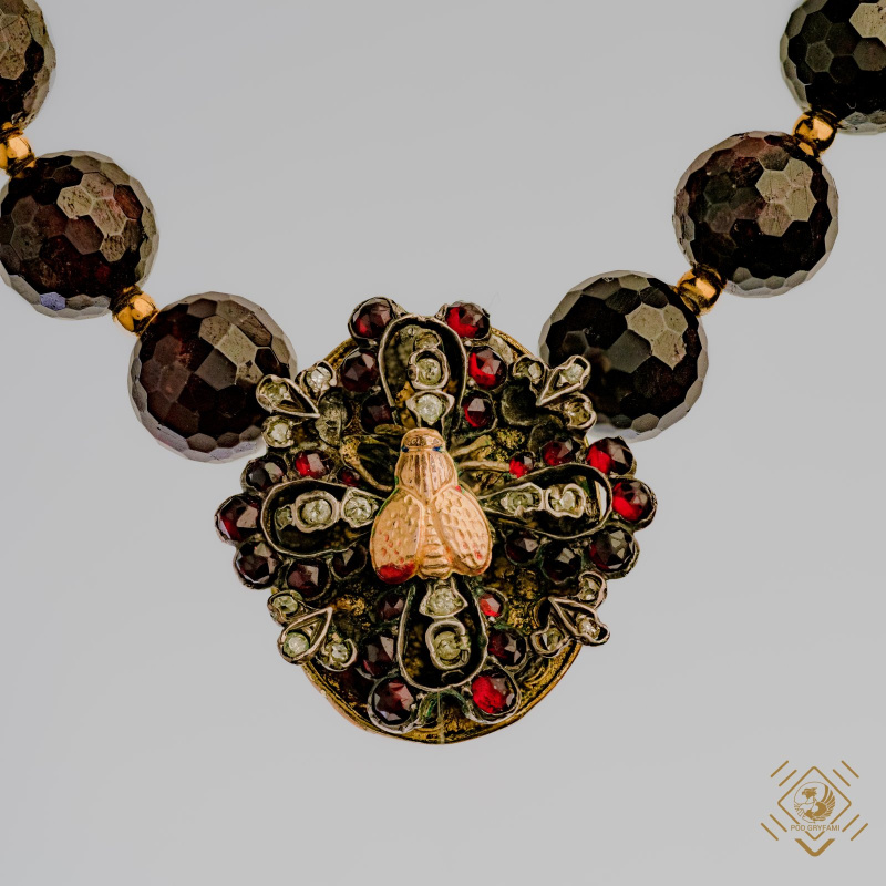 A wonderful string of magnificent almandines in the form of faceted balls. The central part of the necklace is decorated with a medallion made of garnet and diamond rosettes, with a small golden insect in the middle.