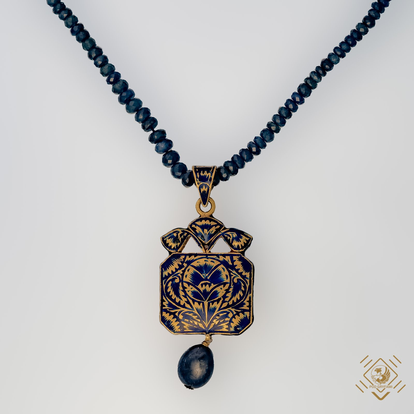 Niezwykły orientalny naszyjnik, którego clou stanowi dwustronny wykonany ze złota wisior. Wisior z jednej strony ozdobiony jest grawerowanym kwarcem oraz rozetami diamentowymi z drugiej piękną kobaltową emalią.